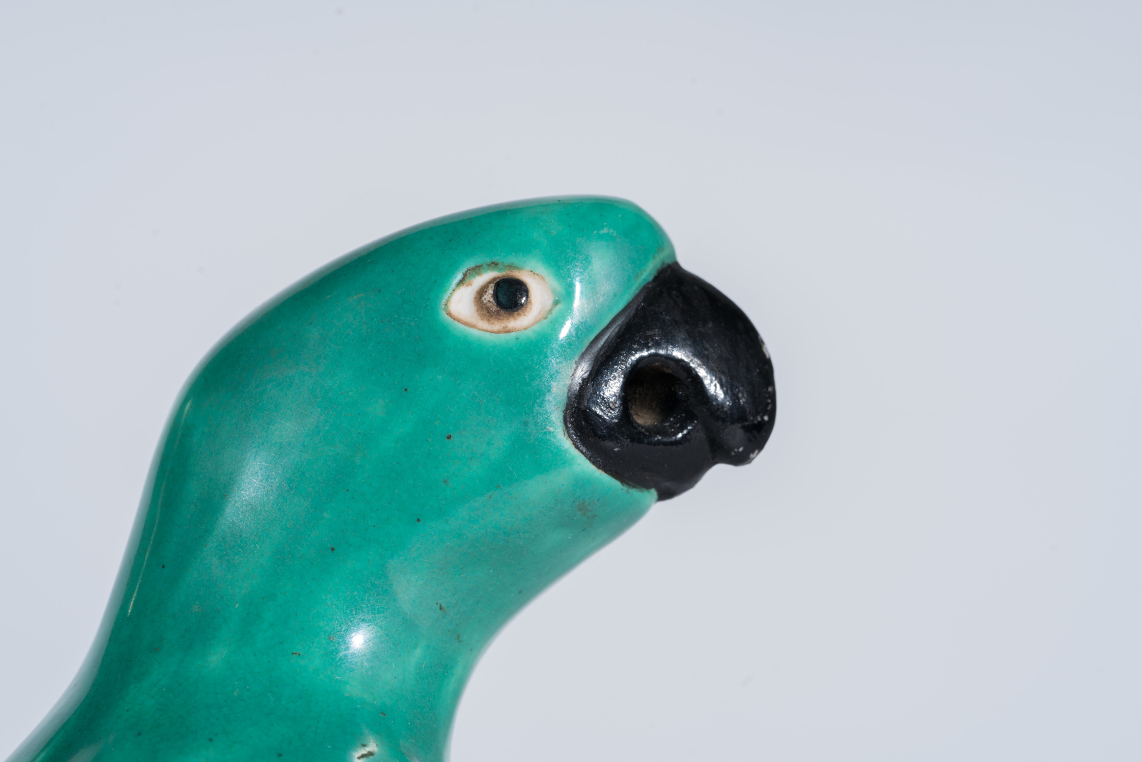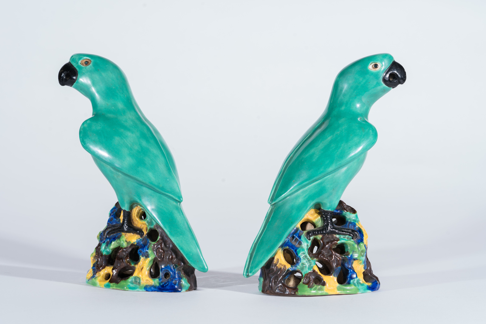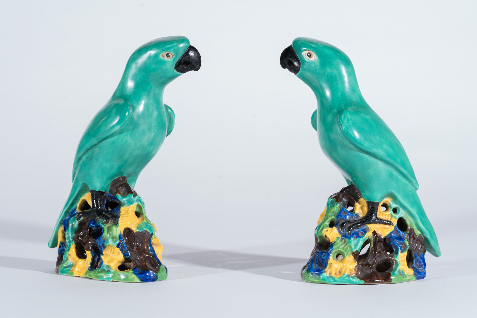 Chinese Art A pair of green glazed porcelain parrots standing on rocks