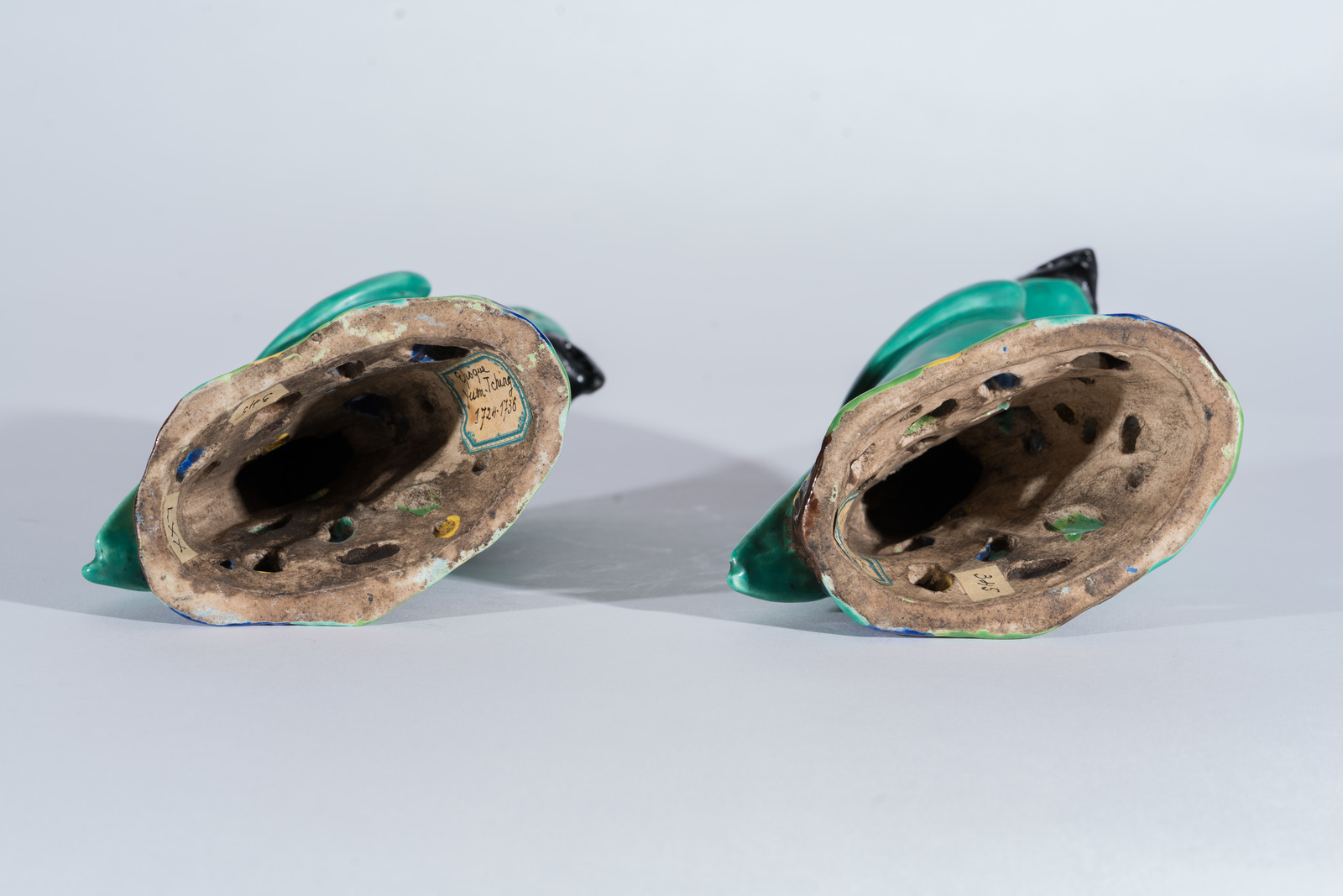 Cina, dinastia Qing, periodo Kangxi, 1661-1722 . . Cm 13,00 x 20,30. entrambi poggianti su rocce traforate ed invetriate di blu, marrone, verde e giallo. Etichetta di un'antica collezione all'interno della base.
