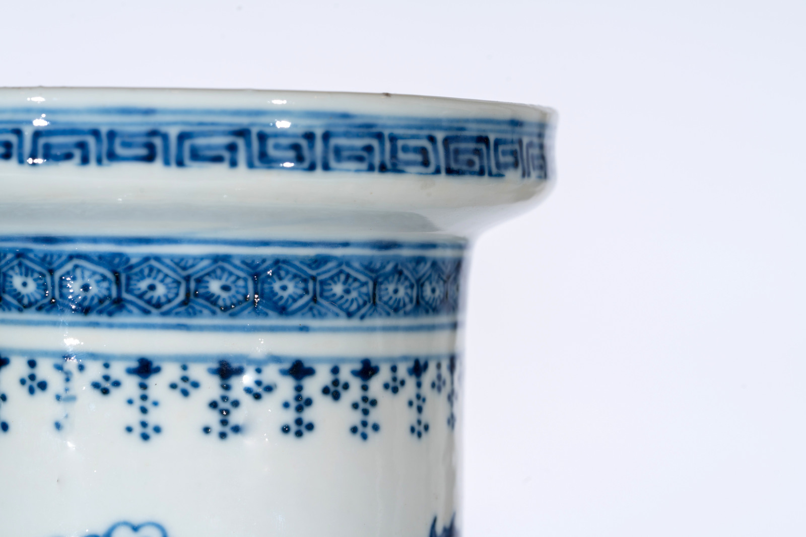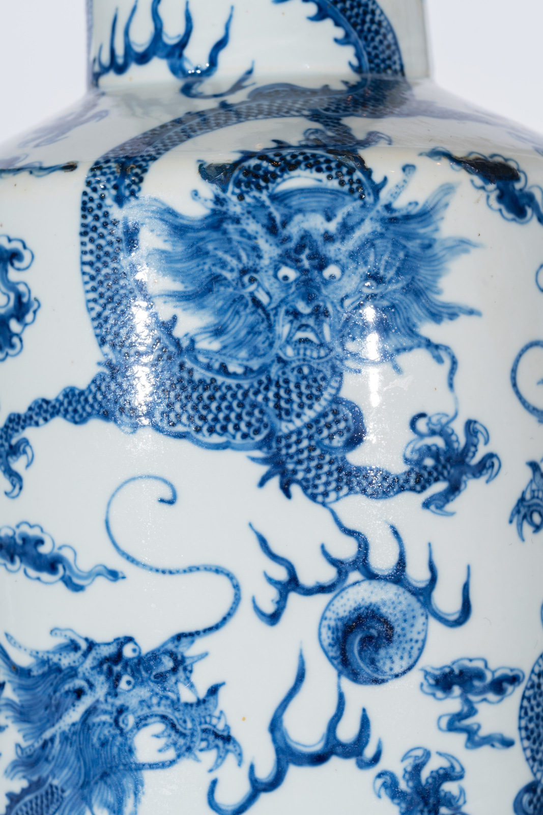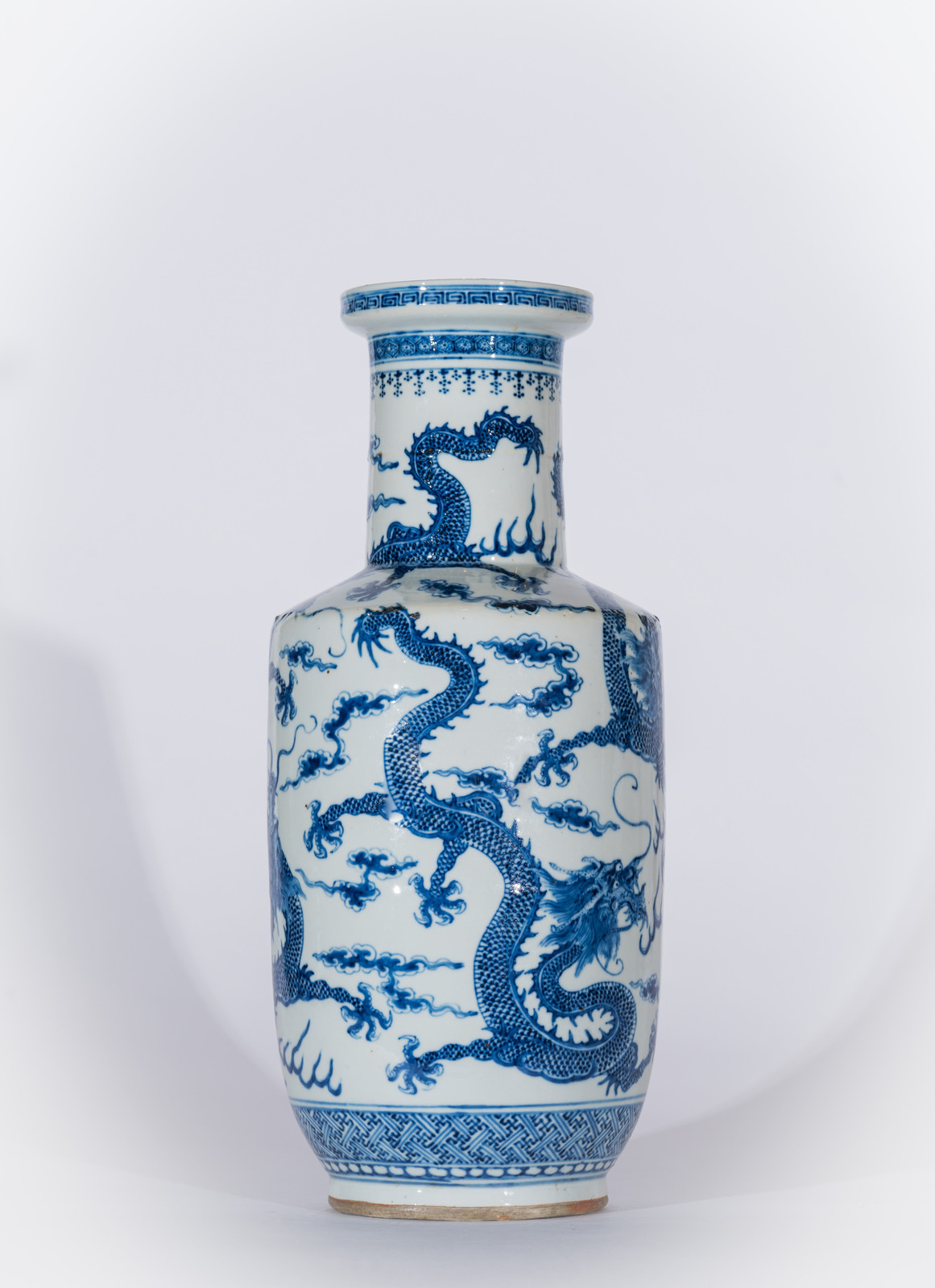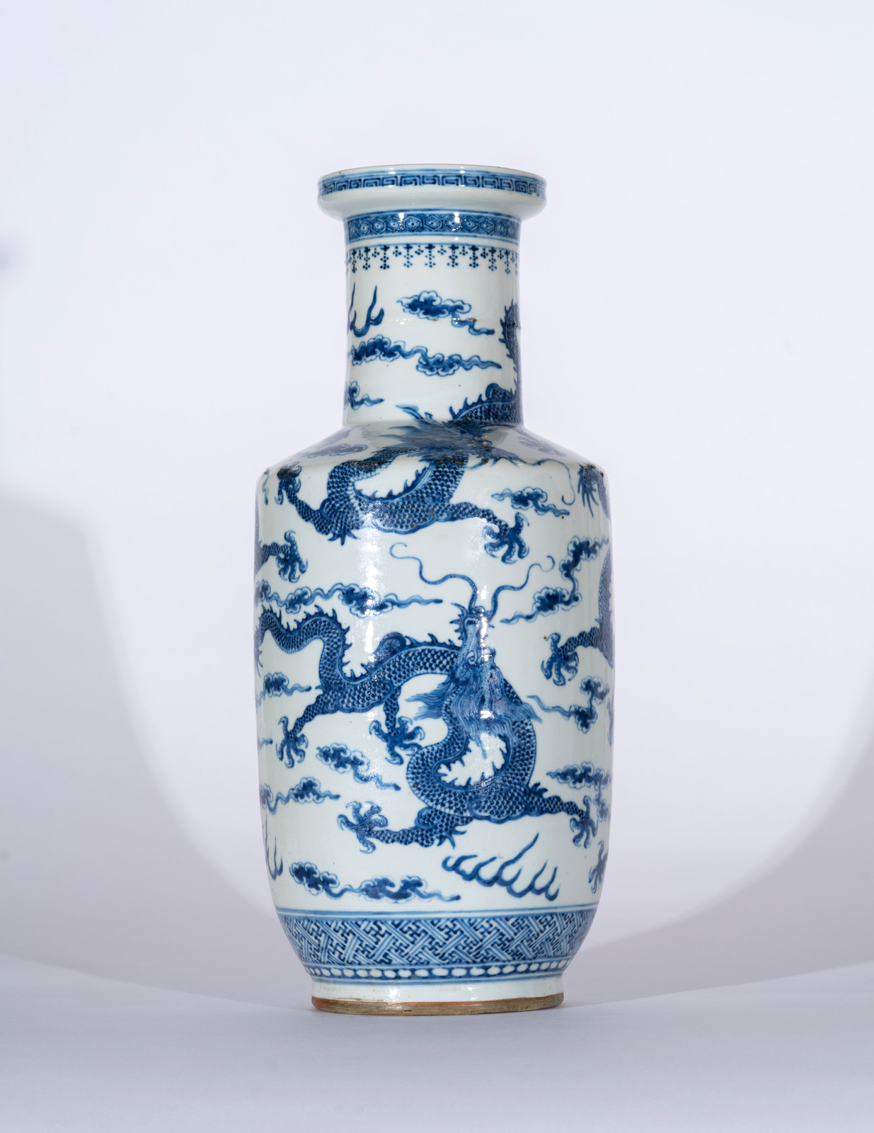 China, Qing dynasty, Kangxi period, 1661-1722. . Cm 18,00 x 45,00. Bangchuiping rouleau vase with circular base and tall cylindrical neck. It is finely painted with blue underglaze and presents a fine motif depicting five clawed dragons chasing the flaming pearl among stylized clouds and flames. The lip and the base are adorned with thin bands of meander motifs. Both the base painting and the dragons' details, in particular their ferocious maws, are particularly worthy of notice.