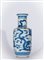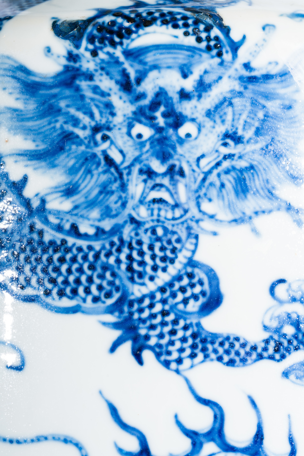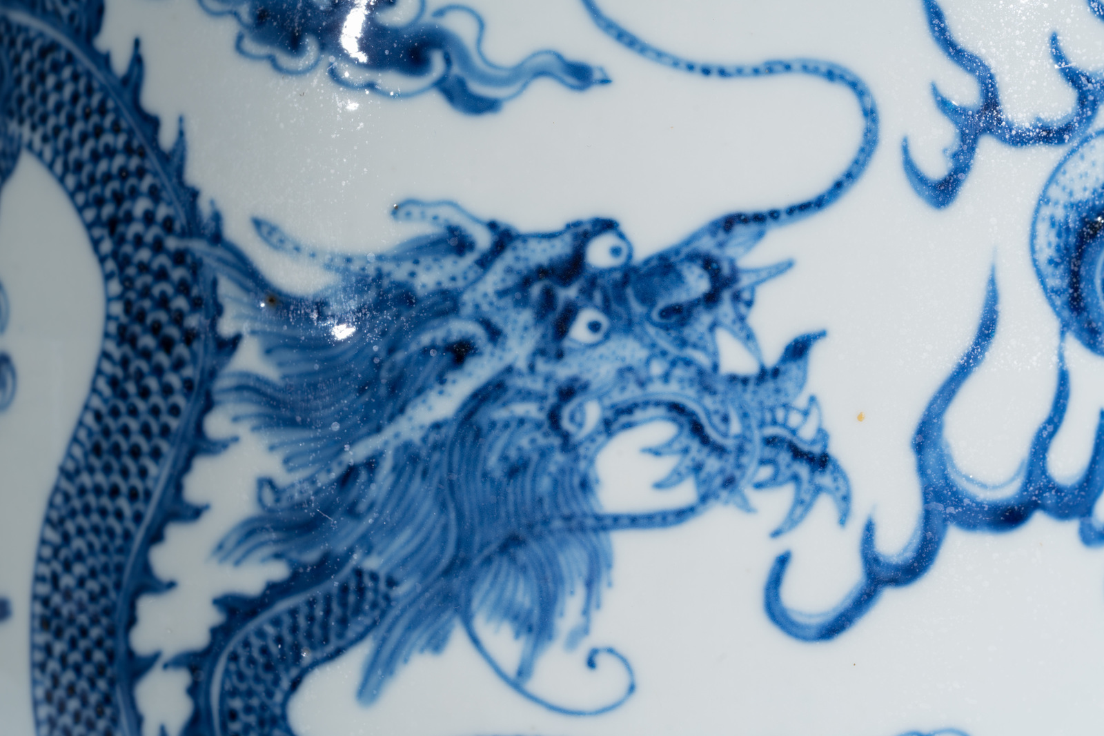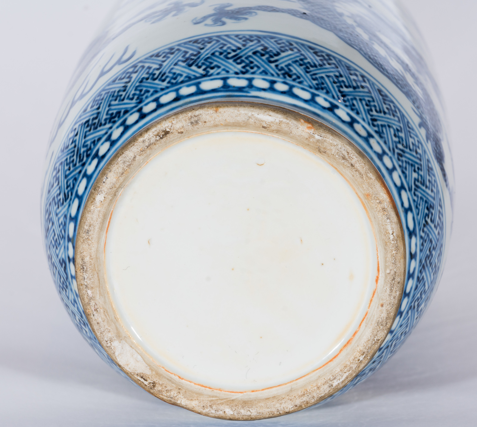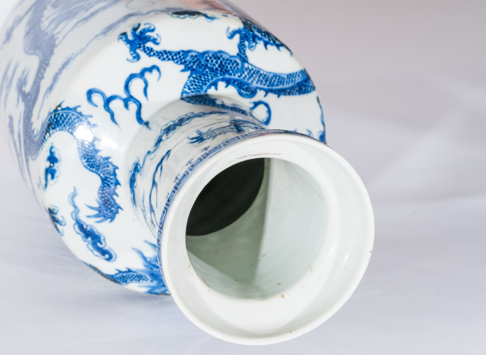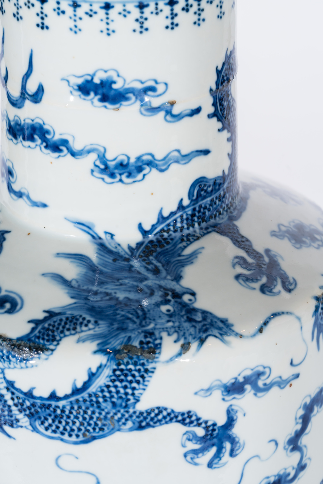Cina, dinastia Qing, periodo Kangxi, 1661-1722 . . Cm 18,00 x 45,00. Vaso bangchuiping (a rullo) a sezione circolare con alto collo cilindrico; la superficie finemente dipinta in blu cobalto sottocoperta con motivo di dragoni a cinque artigli che si sviluppano sinuosamente all'inseguimento della perla fiammeggiante tra nuvole e fiamme stilizzate. La bocca e la base del vaso abbellite da sottili bande decorate con greche.