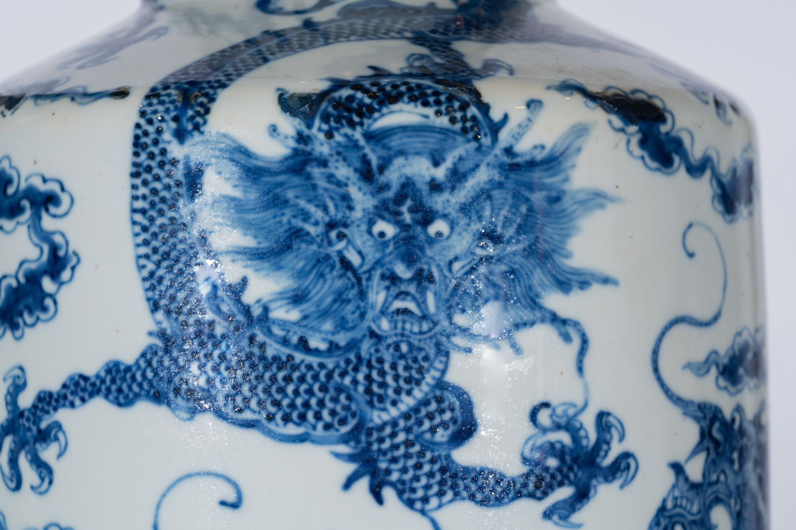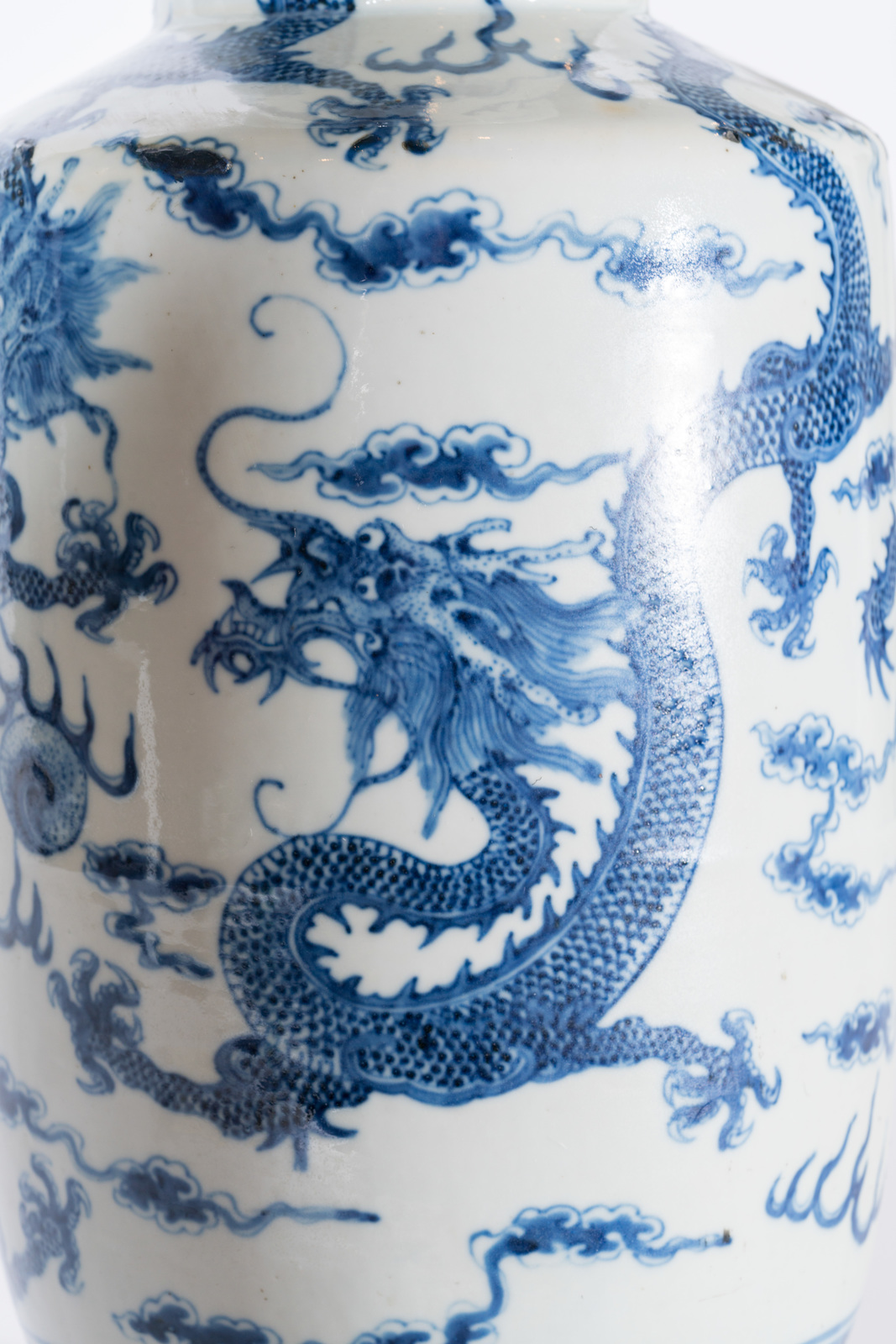 Chinese Art A blue and white bangchuiping rouleau porcelain five dragons vase underglaze painted with dragons chasing the flaming pearl among clouds