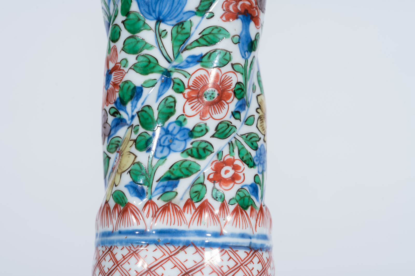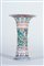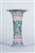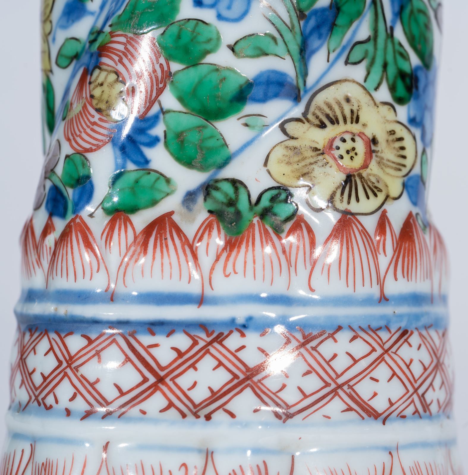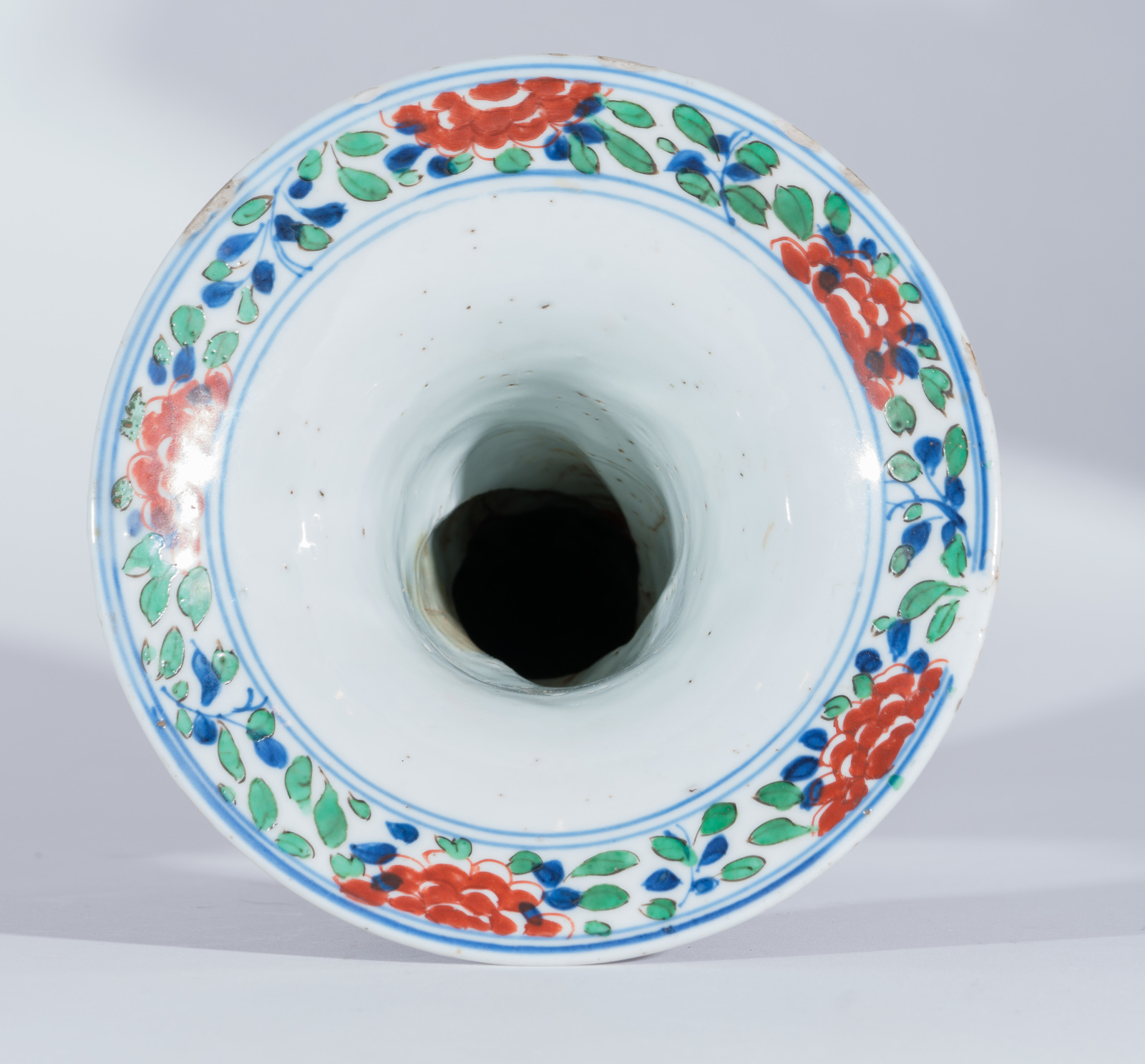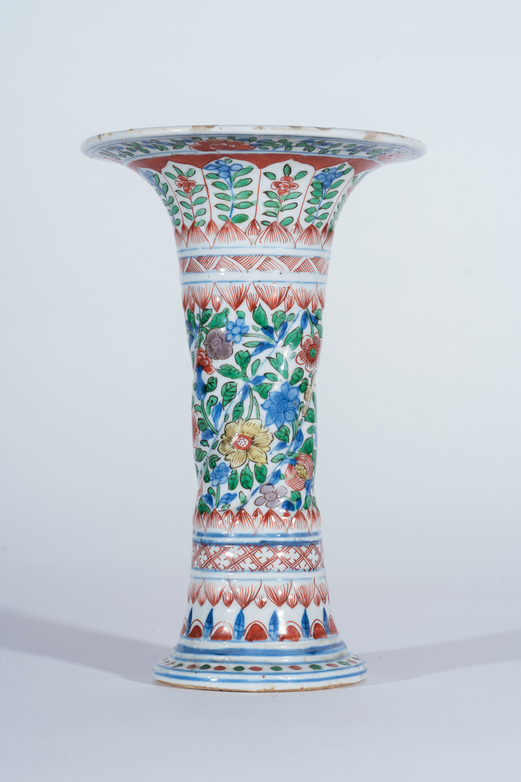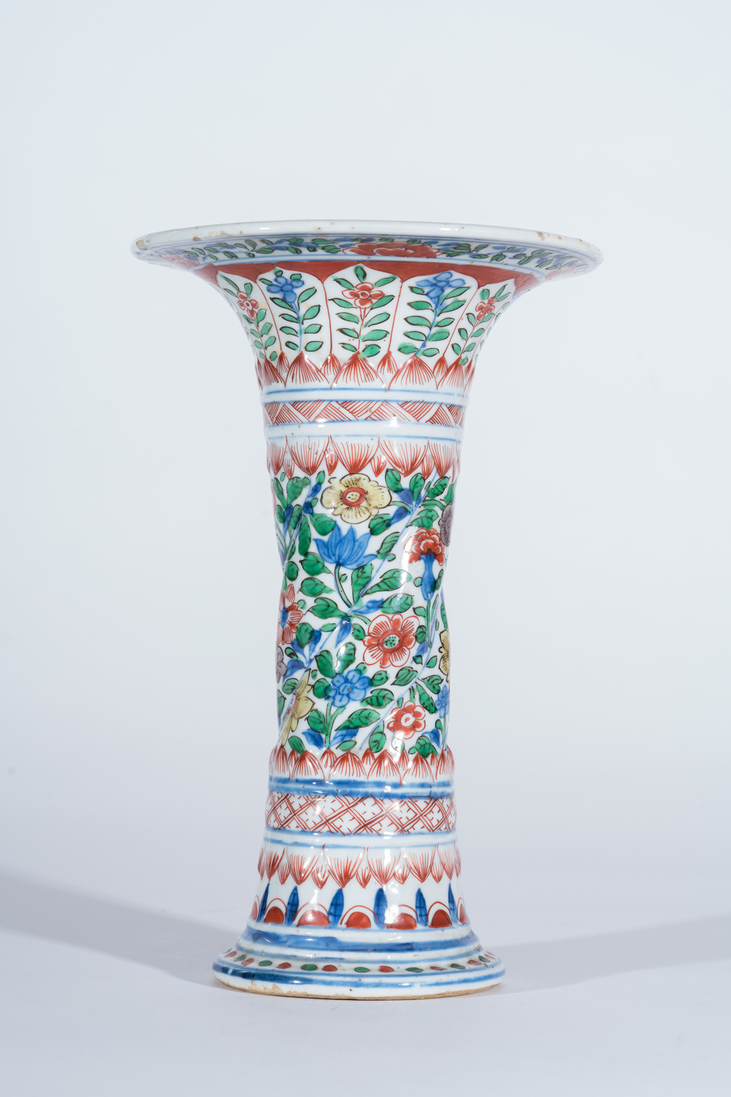 Cina, periodo Transizione, XVII secolo . . Cm 17,00 x 26,30. dalla classica forma Gu, a sezione circolare, il fusto modellato a torchon e la bocca svasata. La superficie dipinta in sezioni orizzontali a motivo floreale con blu sottocoperta e smalti rosso, verde e giallo sovracoperta.