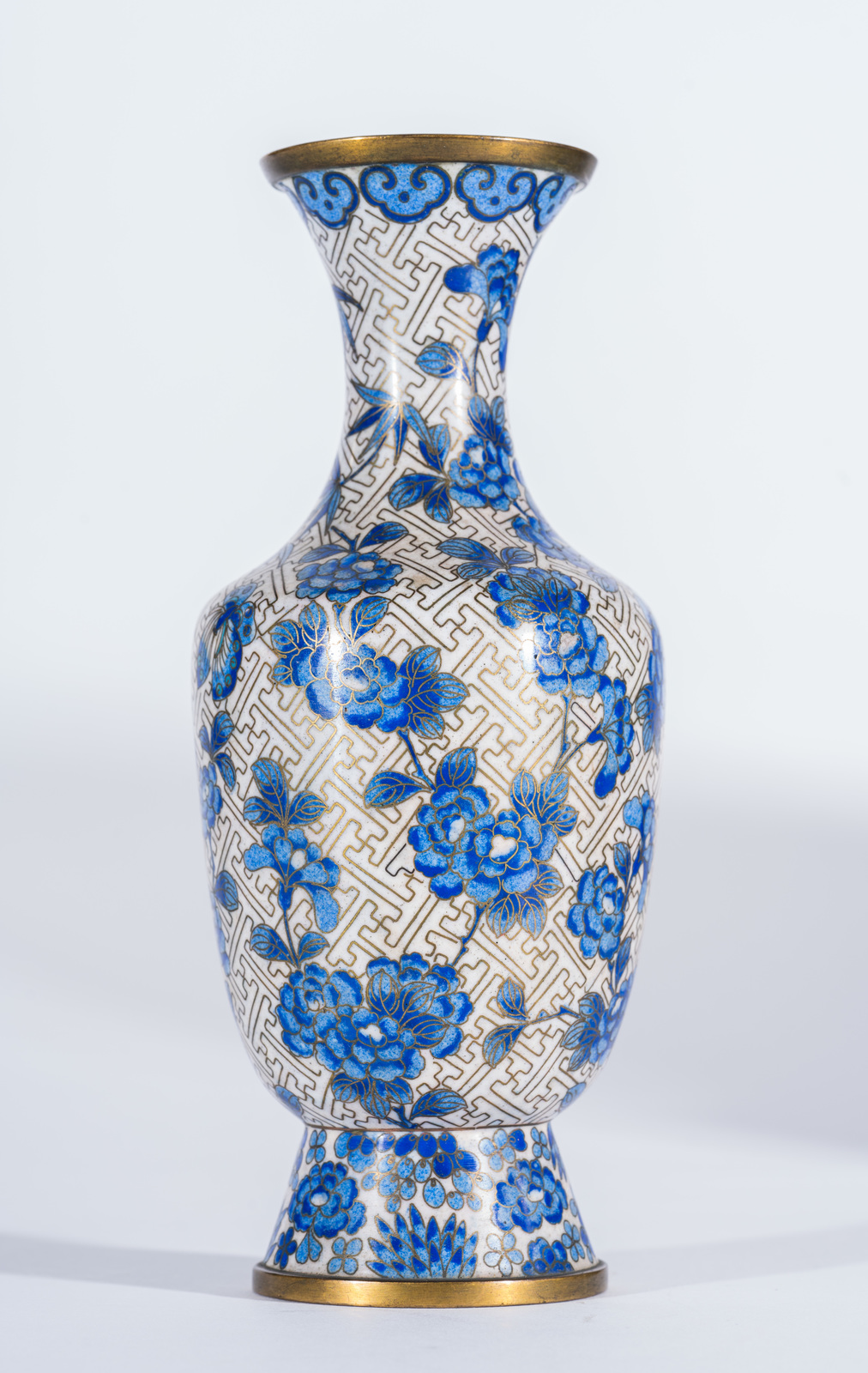 Chinese Art A cloisonné vase decorated with blue flowers over white geometrical ground