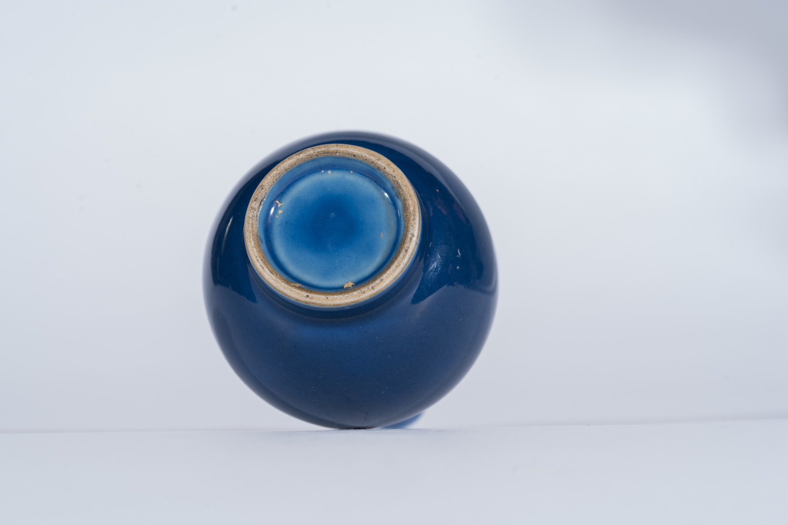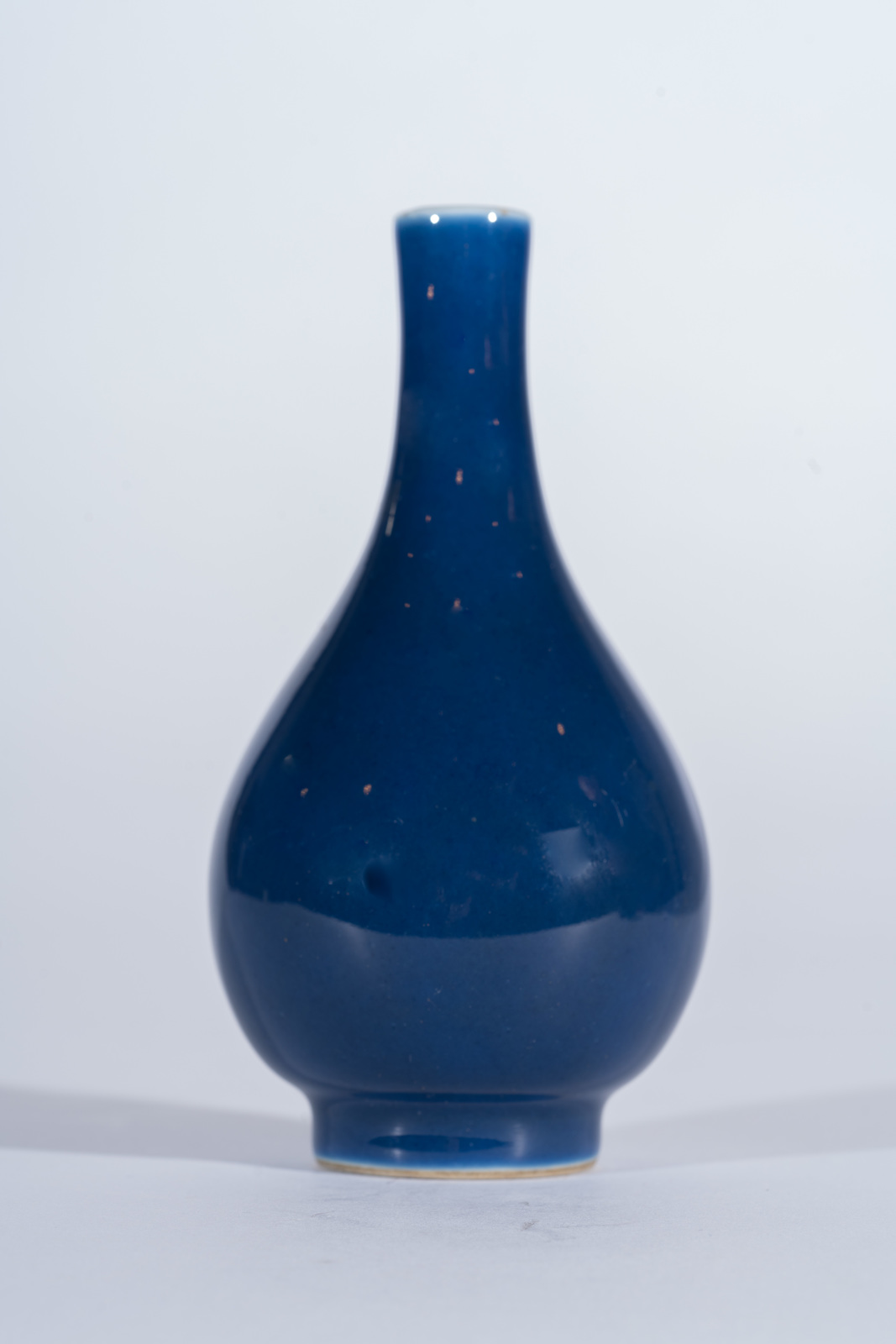 Cina, dinastia Qing, XVIII secolo . . Cm 7,00 x 14,00. poggiante su disco, il corpo piriforme interamente ricoperto di delicata vetrina blu.