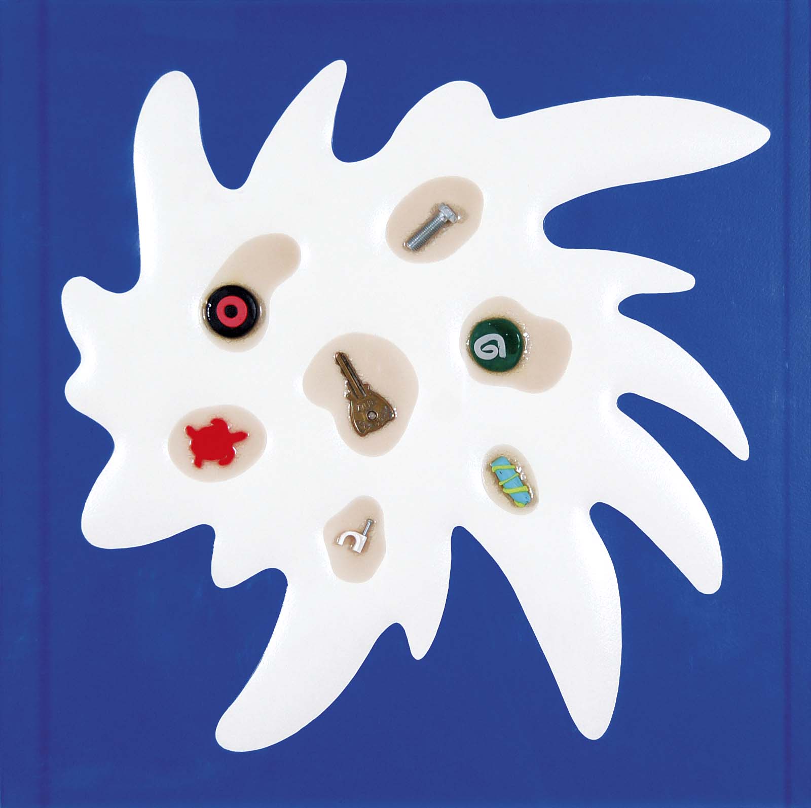 NUCARA RENZO Crema 1955 Bang 10-37 2011 legno, carta, colore serigrafico, resine e oggetti su tavola opera unica 50x50 cm firma al retro autentica dell'Autore nr. Arch. 0114174 su foto
