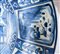 Arte Giapponese Grande vassoio in porcellana arita Giappone, XVII secolo . . Cm 58,50 x 14,00. Grande piatto bianco e blu, il tondo centrale dipinto con un vaso di fiori, la tesa suddivisa in pannelli contenenti elementi vegetali e personaggi impegnati in diverse attività.