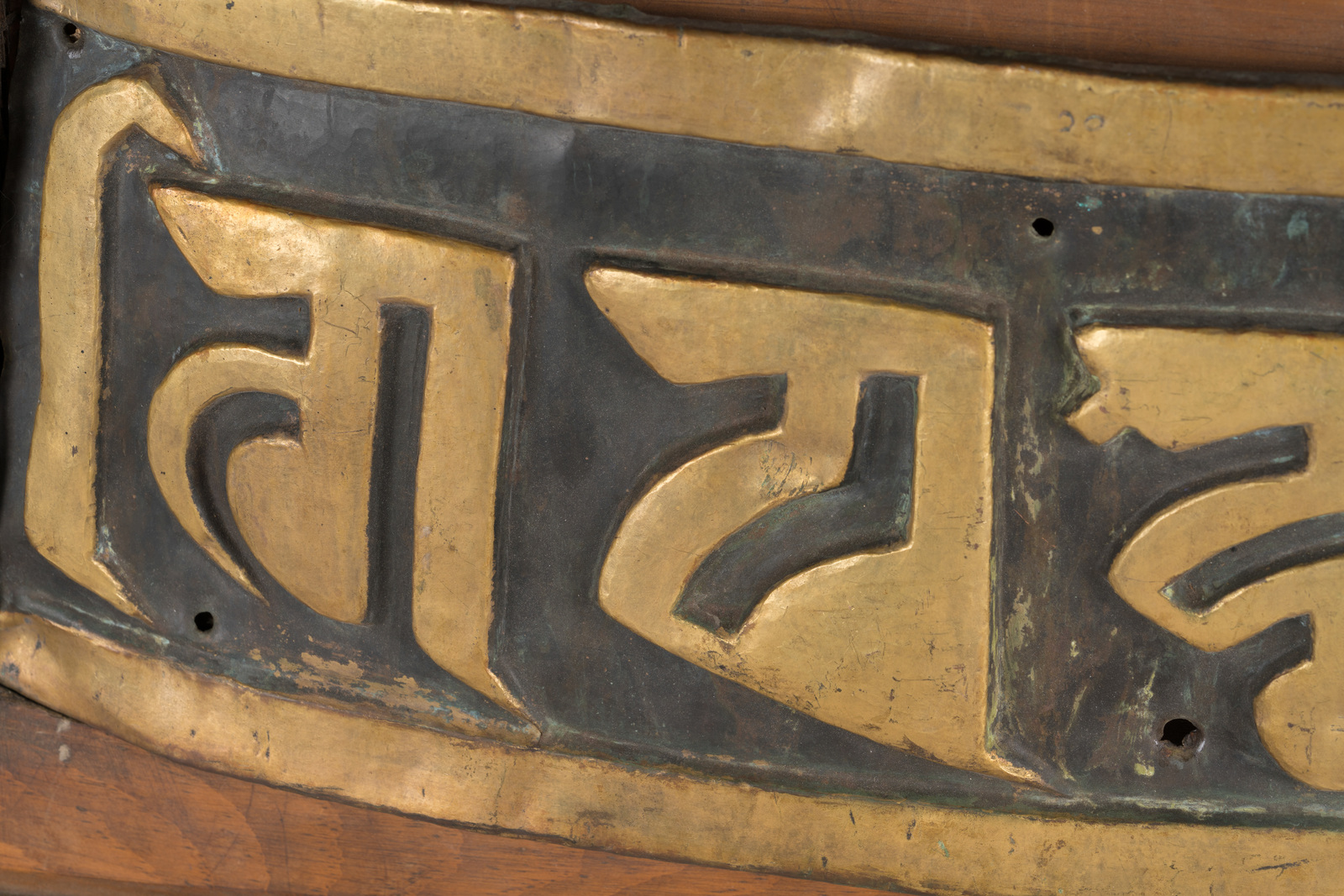 Arte Himalayana Frammento di grande ruota da preghiera in metallo sbalzato