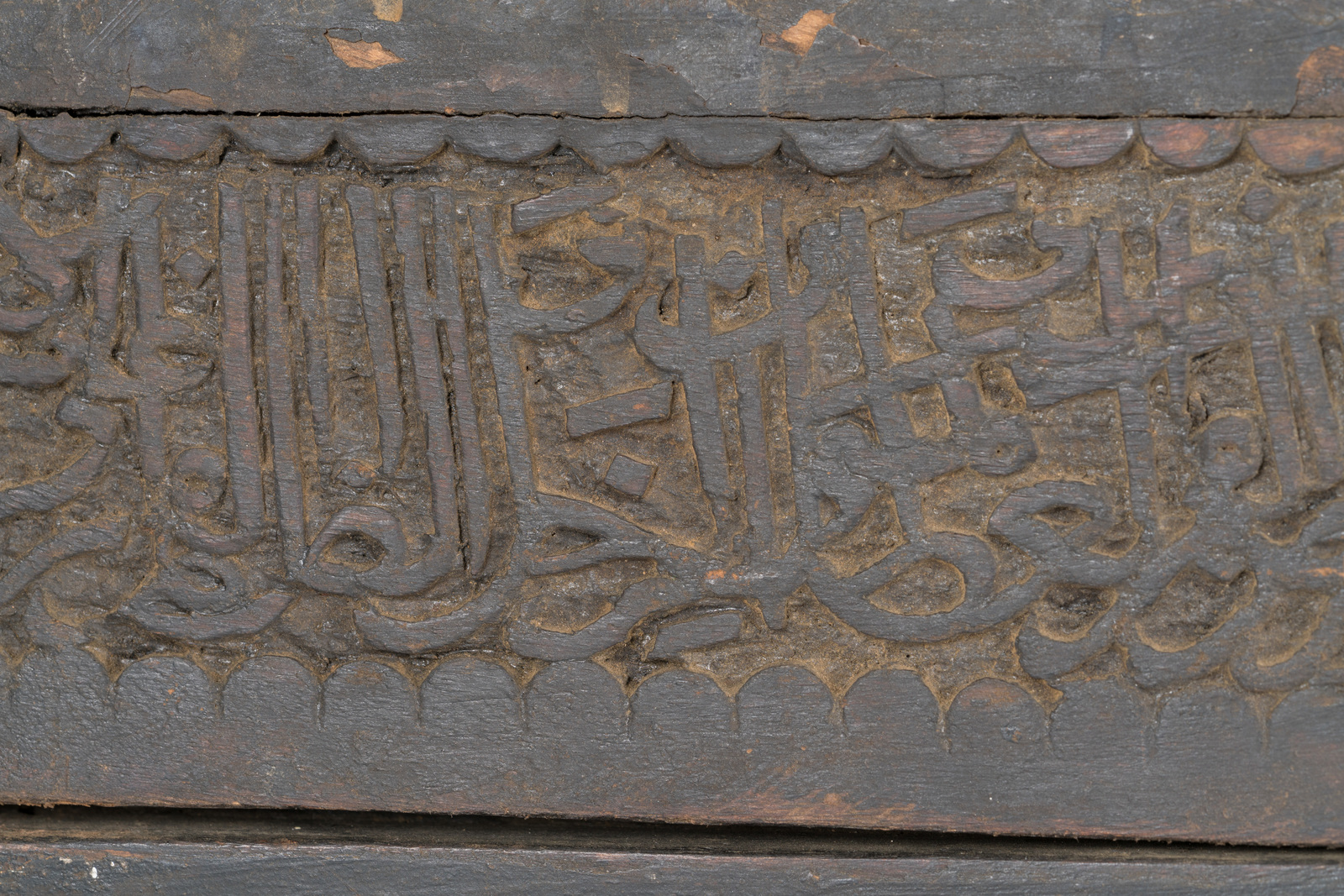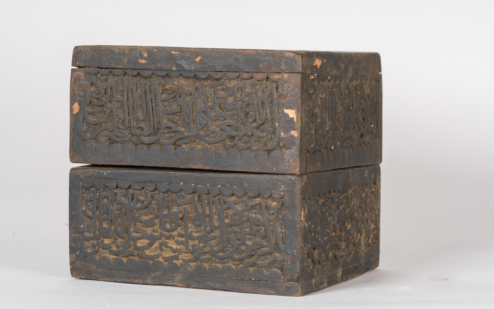 Turchia, XIX secolo . . Cm 22,00 x 21,00 x 21,00. cofanetto quadrato in legno intagliato a motivo calligrafico contenente lo strumento scientifico in ottone inciso.
