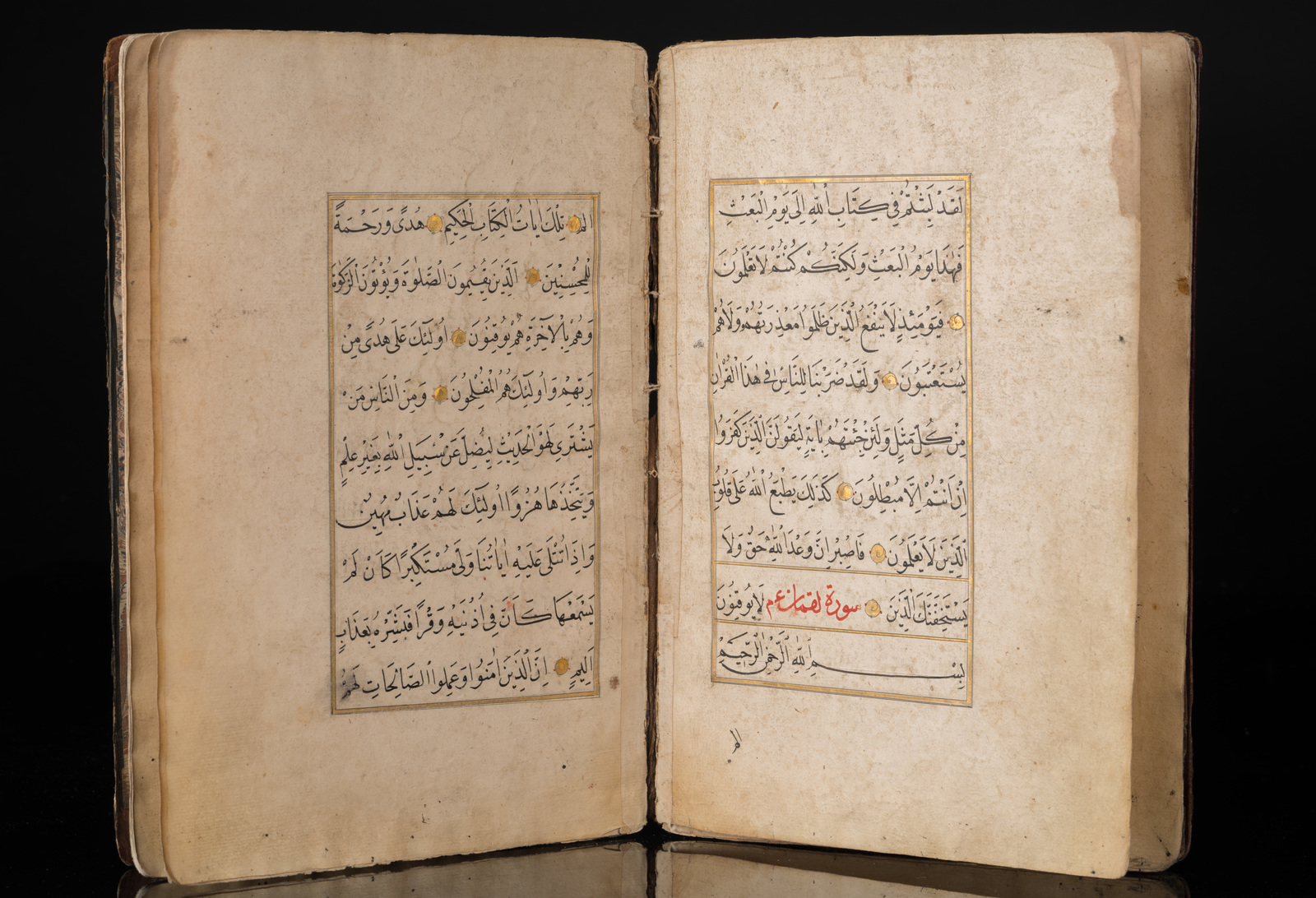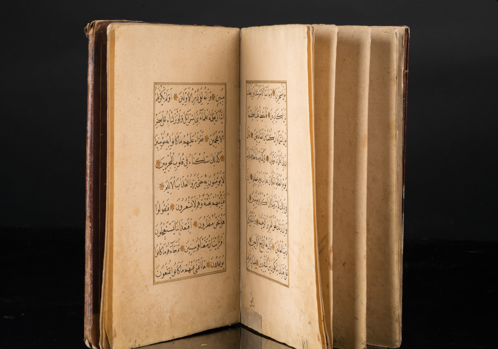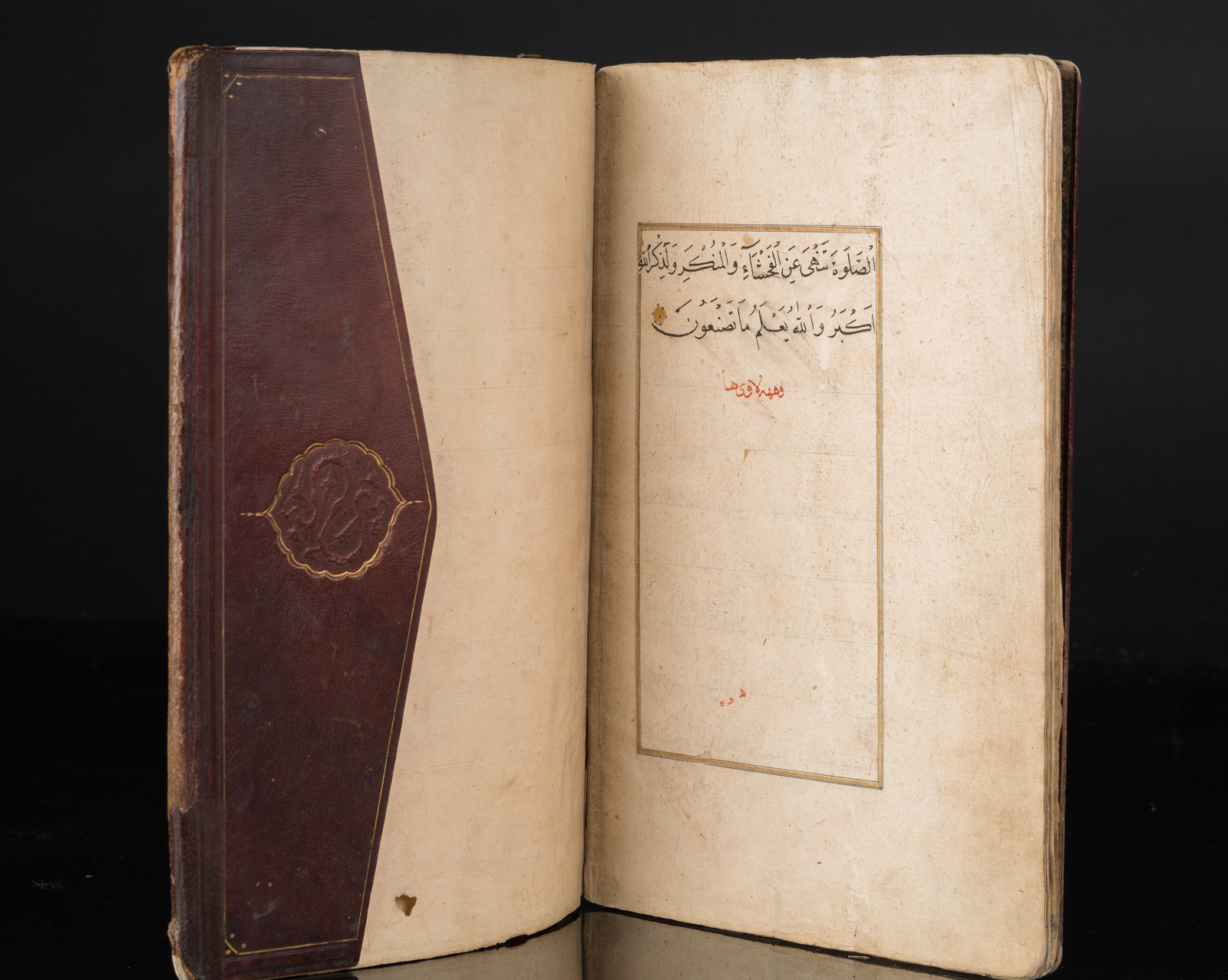 Ottoman Turkey, 18th century . . Cm 19,00 x 27,50. Three Arabic manuscripts on paper. 9 lines to the page, written in naskh script, black ink and red headings. Gilded rosette and catchwords. Leather cover with flap, impressed with central floral lobed medallion.