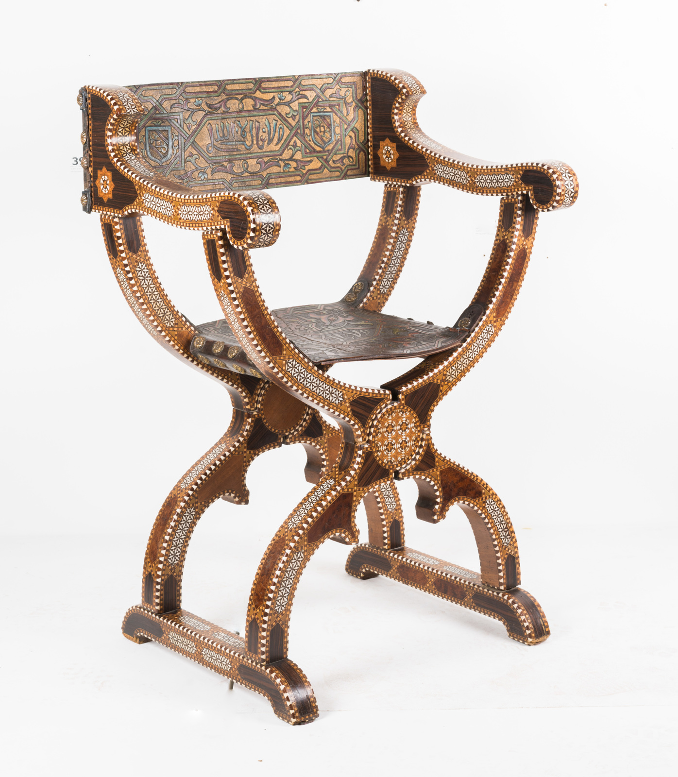 Spagna, XIX secolo . . Cm 64,00 x 95,00 x 48,00. Raffinata poltrona in legno, con gambe arcuate terminanti a X, seduta e schienale in cuoio finemente decorato e tinto con elementi floreali e stelle ad otto punte convergenti verso un cartiglio lobato centrale iscritto. Lo schienale mostra due stemmi con fascia diagonale che evocano lo stemma nasride. La struttura in legno risulta finemente intarsiata a marchetteria con micro tessere in avorio, osso e legno tinto a formare decori geometrici e floreali.