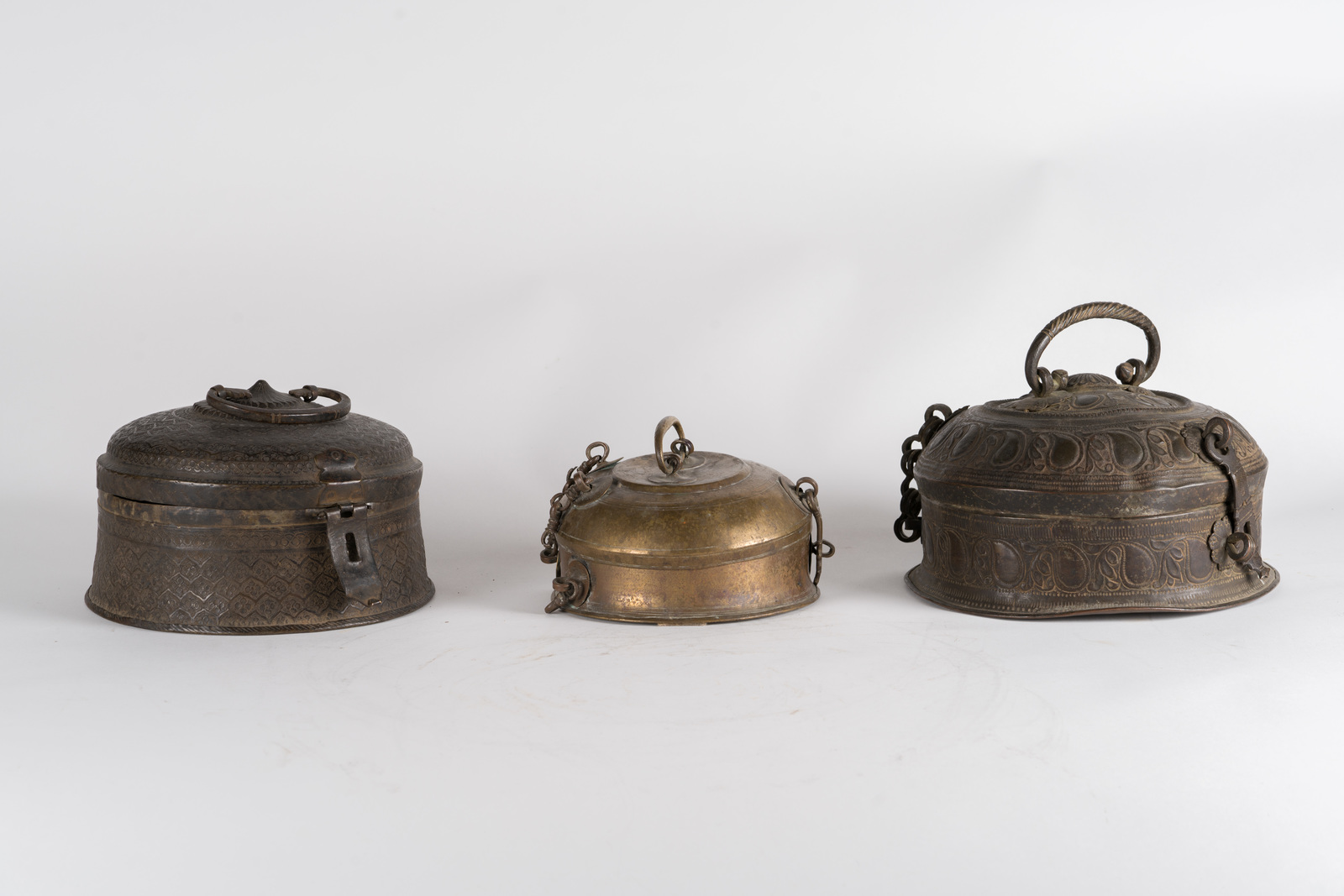 Himalayan Art Three round metal turban or spices boxes embossed with vegetal motifs