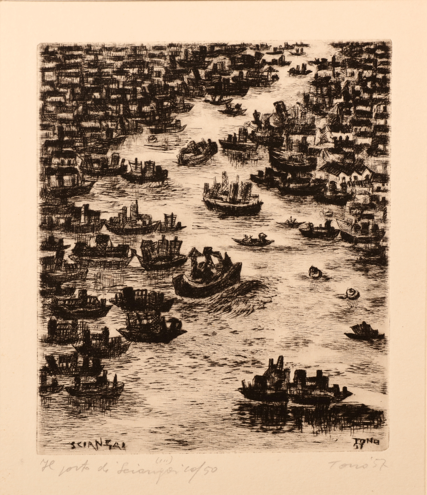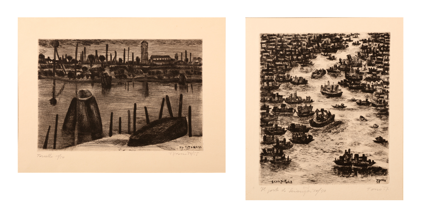 ZANCANARO TONO (1906 - 1985) Lot consisting of 2 sheets. Torcello. Sciangai. Etching. Cm 49,50 x 36,00. First sheet: 15/50. Edition, title, signature and year lower in pencil; signature and year lower right in plate; plate size: 20 x 28 cm;1955. Second sheet: 10/50. Edition, signature, title and year lower in pencil; title, signature and year in plate; plate size: 20 x 17 cm;1957.