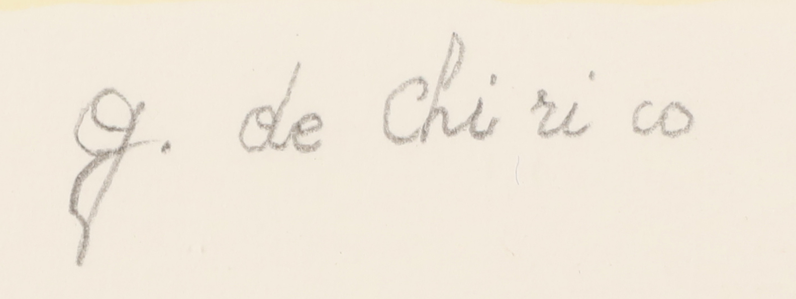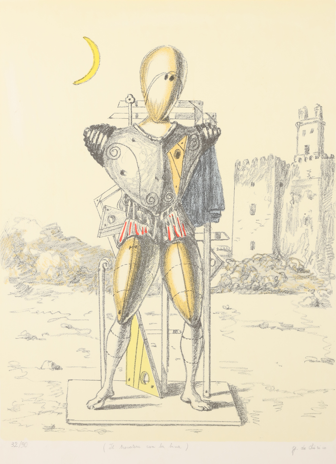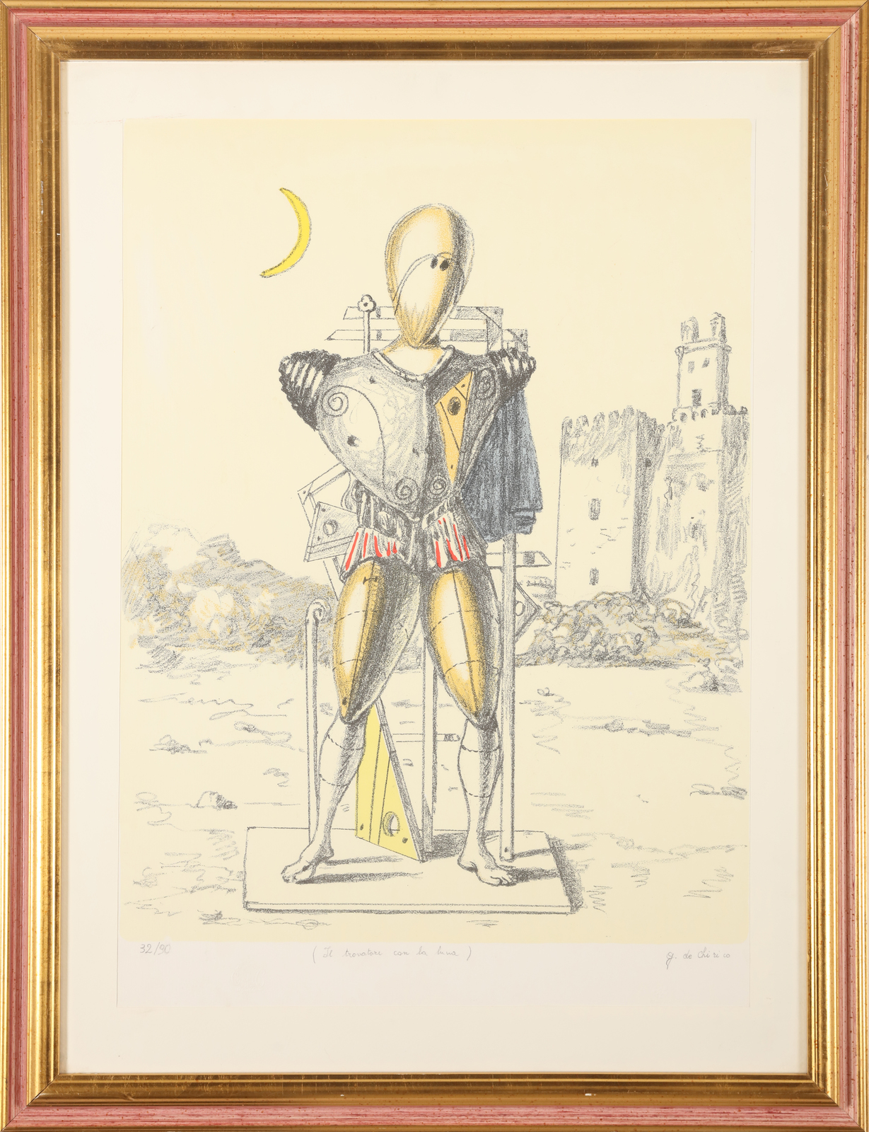 DE CHIRICO GIORGIO (1888 - 1978) The finder with the moon. 1969. Lithograph. Cm 50,00 x 70,00. 32/90. Edition, title and signature lower in pencil. Alberto Caprini Editor stamp lower right and Giorgio De Chirico stamp lower left.. Cornice presente
