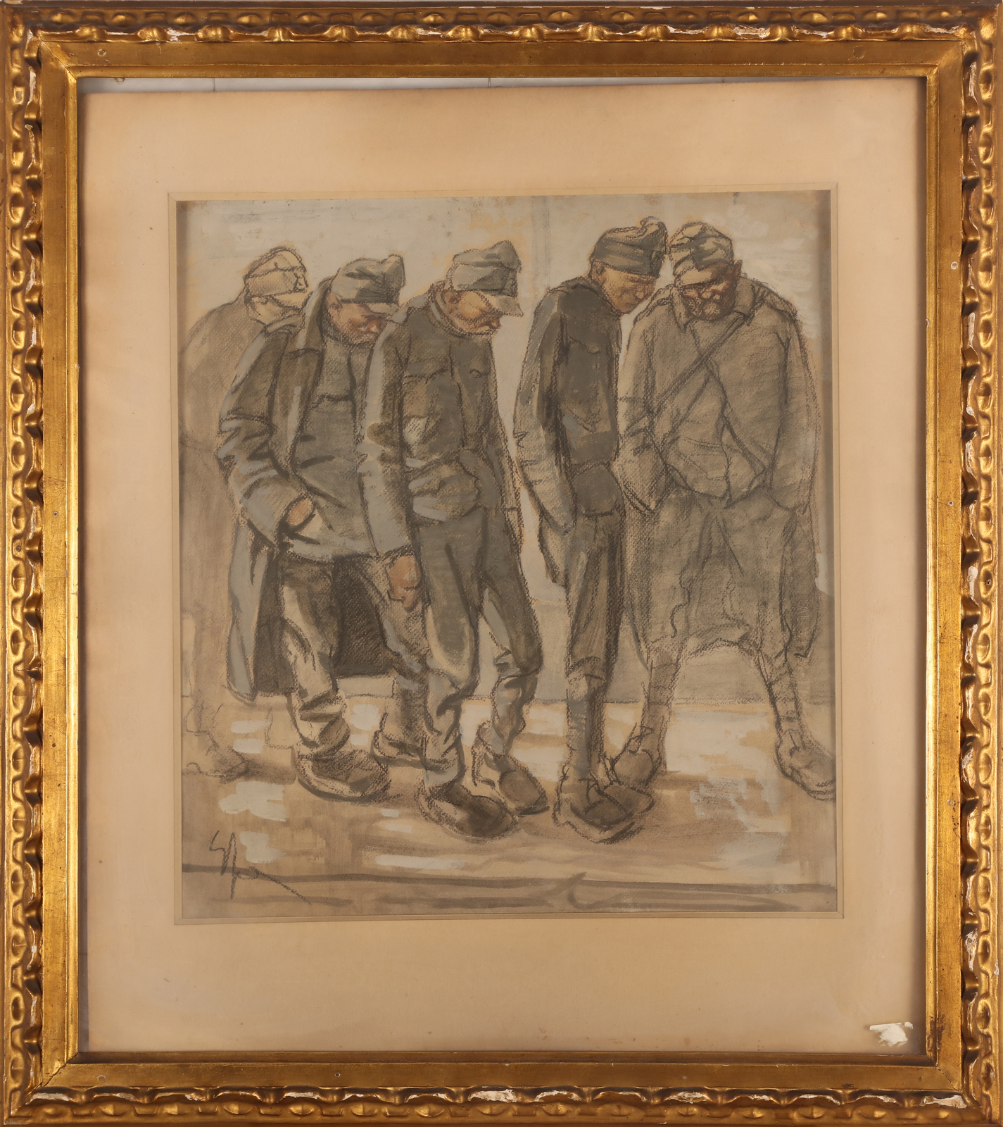 SACCHETTI ENRICO (1877 - 1969) Austrian prisoners. Mixed media on paper. Cm 51,00 x 59,00. Signature lower left. Provenance: Pesaro Gallery, Milan. Cornice presente