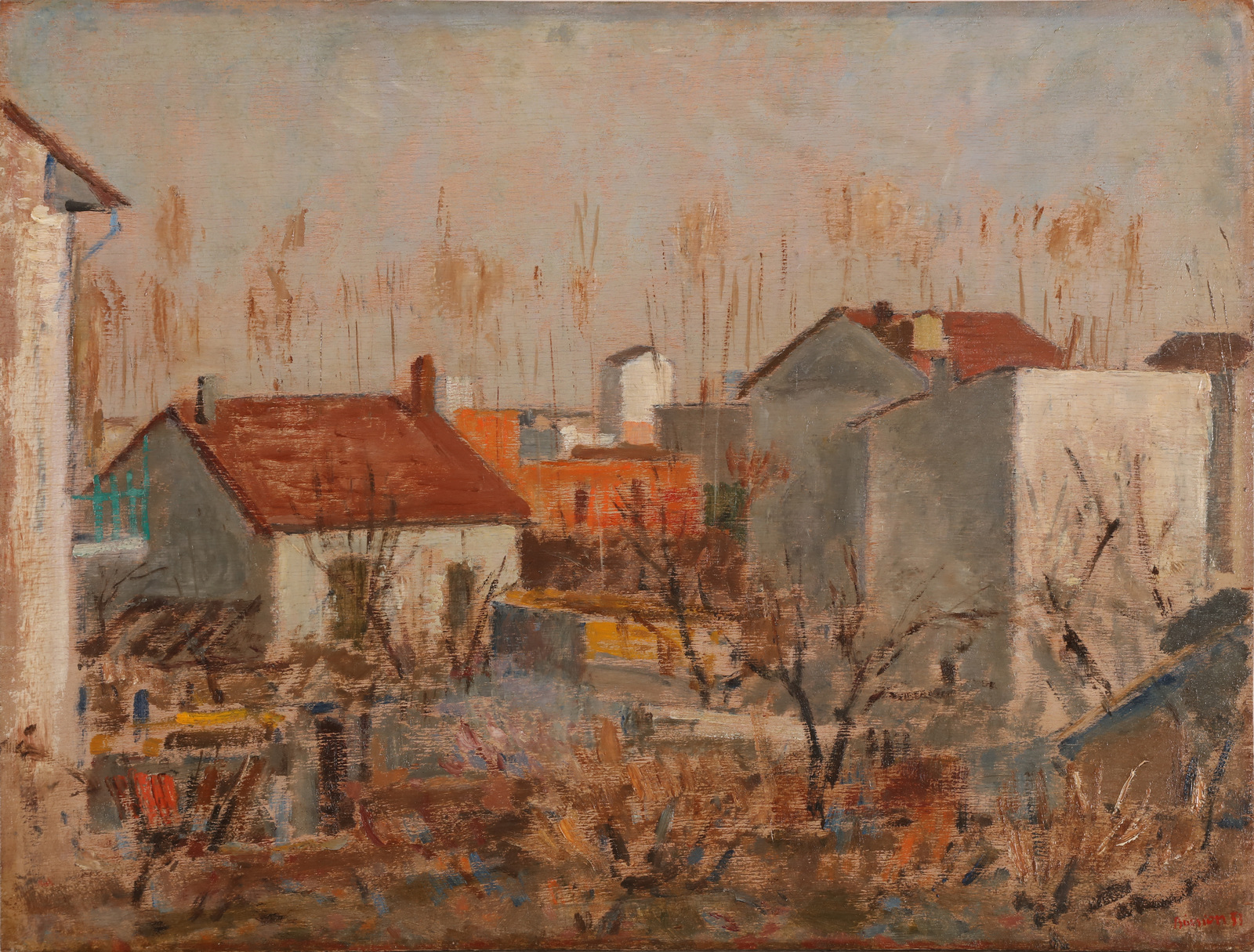 BIASION RENZO (n. 1915) Turinese outskirts. 1955. Oil on board. Cm 40,00 x 30,00. Signature and year lower right. At the back title, signature and year. Cornice presente