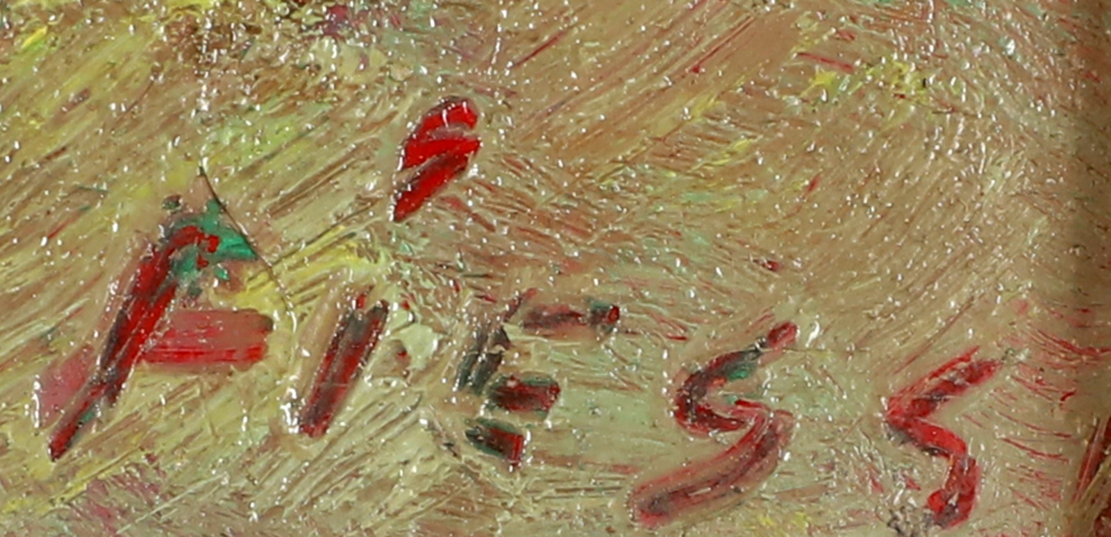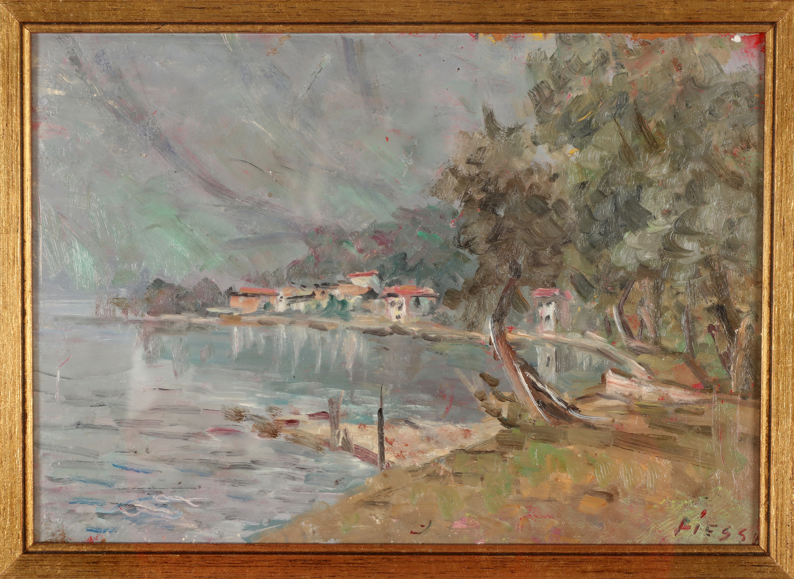 FIESSI ANGELO (1891 - 1977) Lago d'Iseo. 1930. Olio su tavola. Cm 30,00 x 20,00. Firma in basso a desta. Al retro dedica, anno e firma. Cornice presente