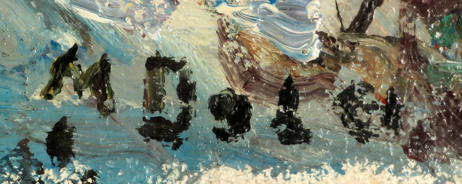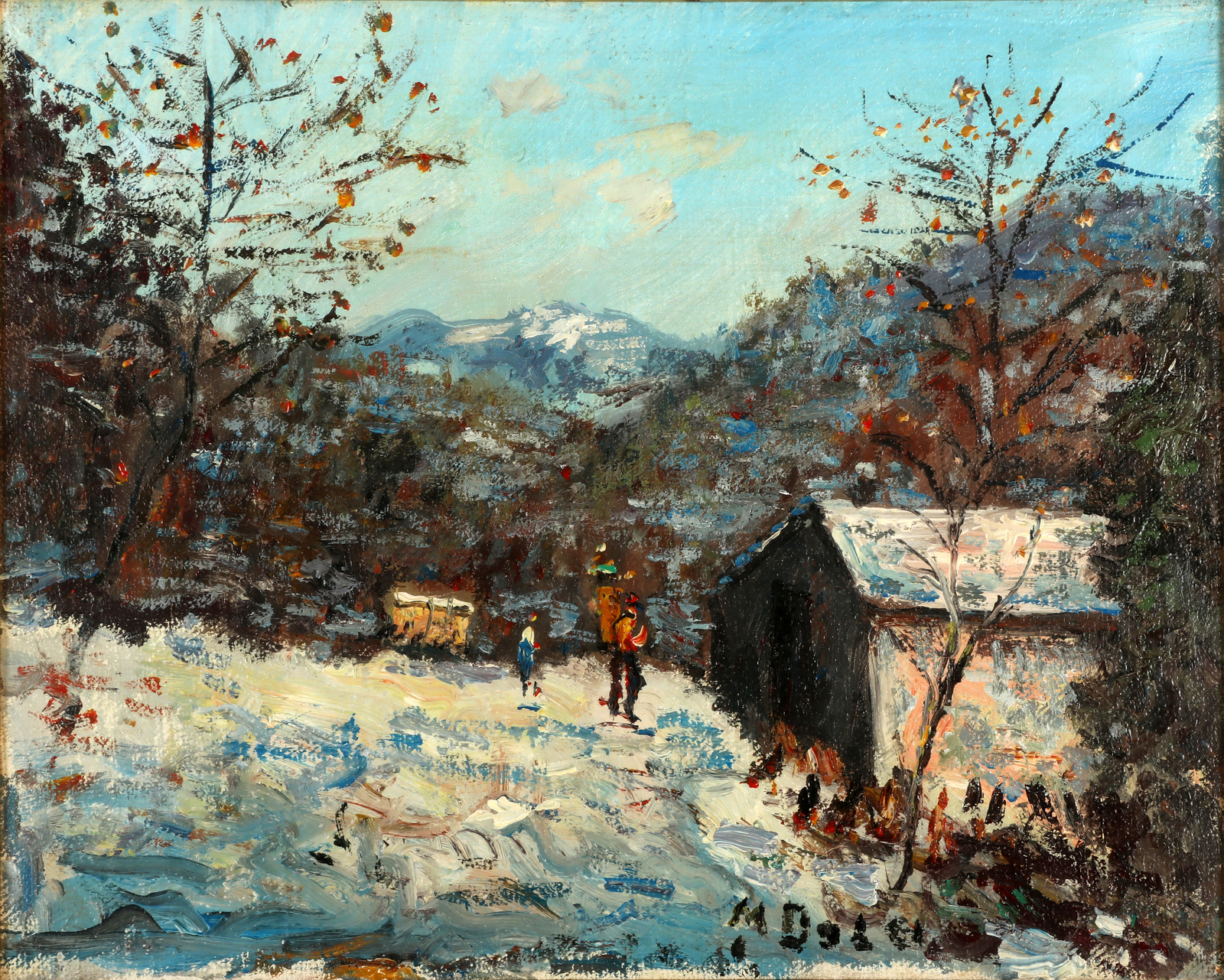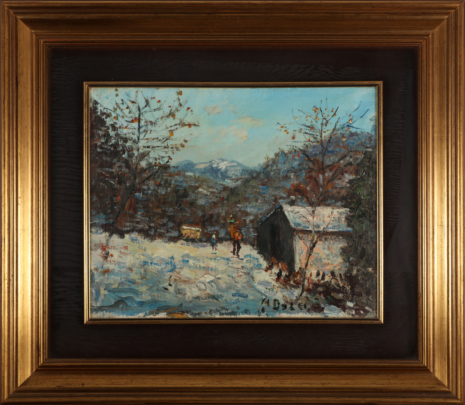 DOLCI MARTINO (1912 - 1994) Paesaggio invernale. Olio su tavola applicata su tela. Cm 50,00 x 40,00. Firma in basso a destra. Cornice presente