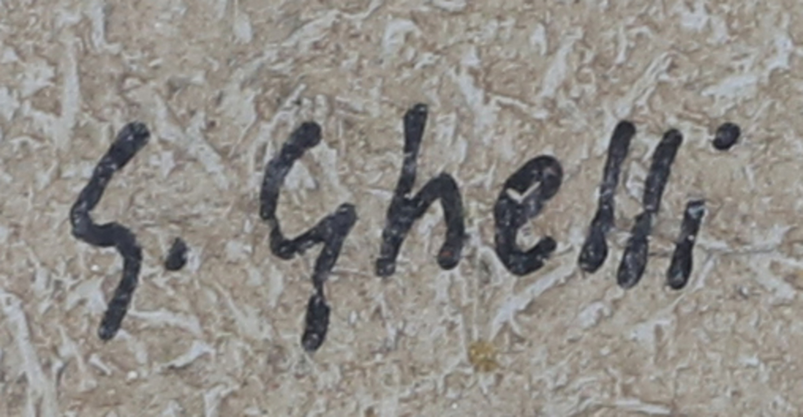 GHELLI GIULIANO (1944 - 2014) Story. Mixed media on plywood. Cm 40,00 x 30,00. Signature lower right. At the back title and signature. Cornice presente