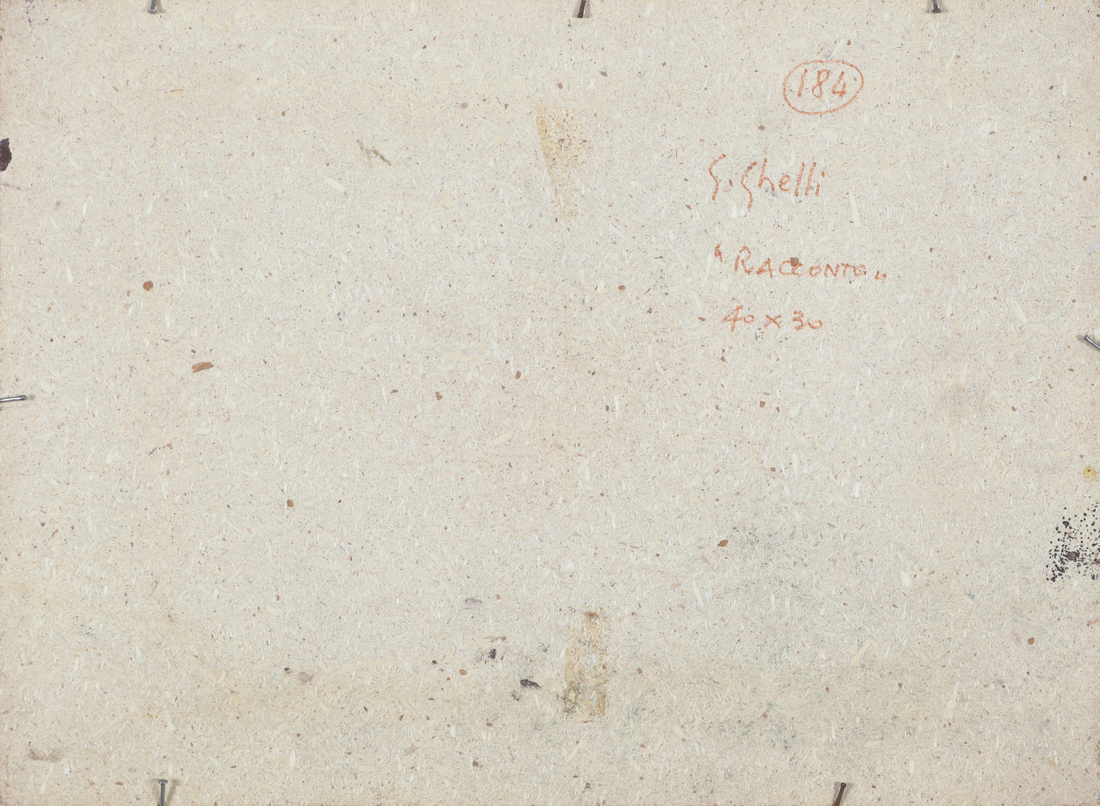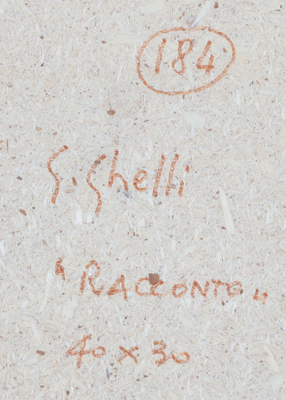 GHELLI GIULIANO (1944 - 2014) Racconto. Tecnica mista su compensato. Cm 40,00 x 30,00. Firma in basso a destra. Al retro titolo e firma. Cornice presente