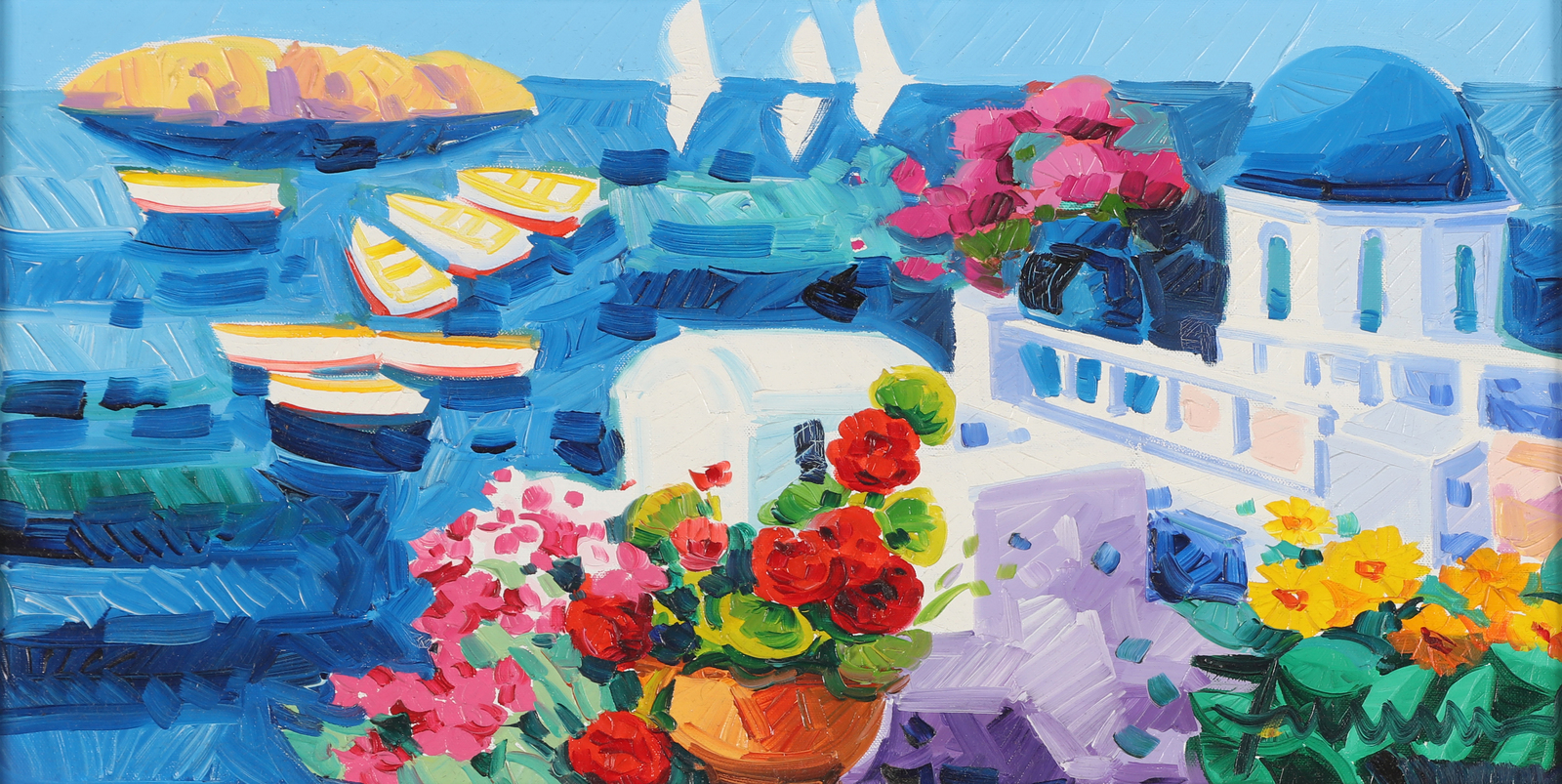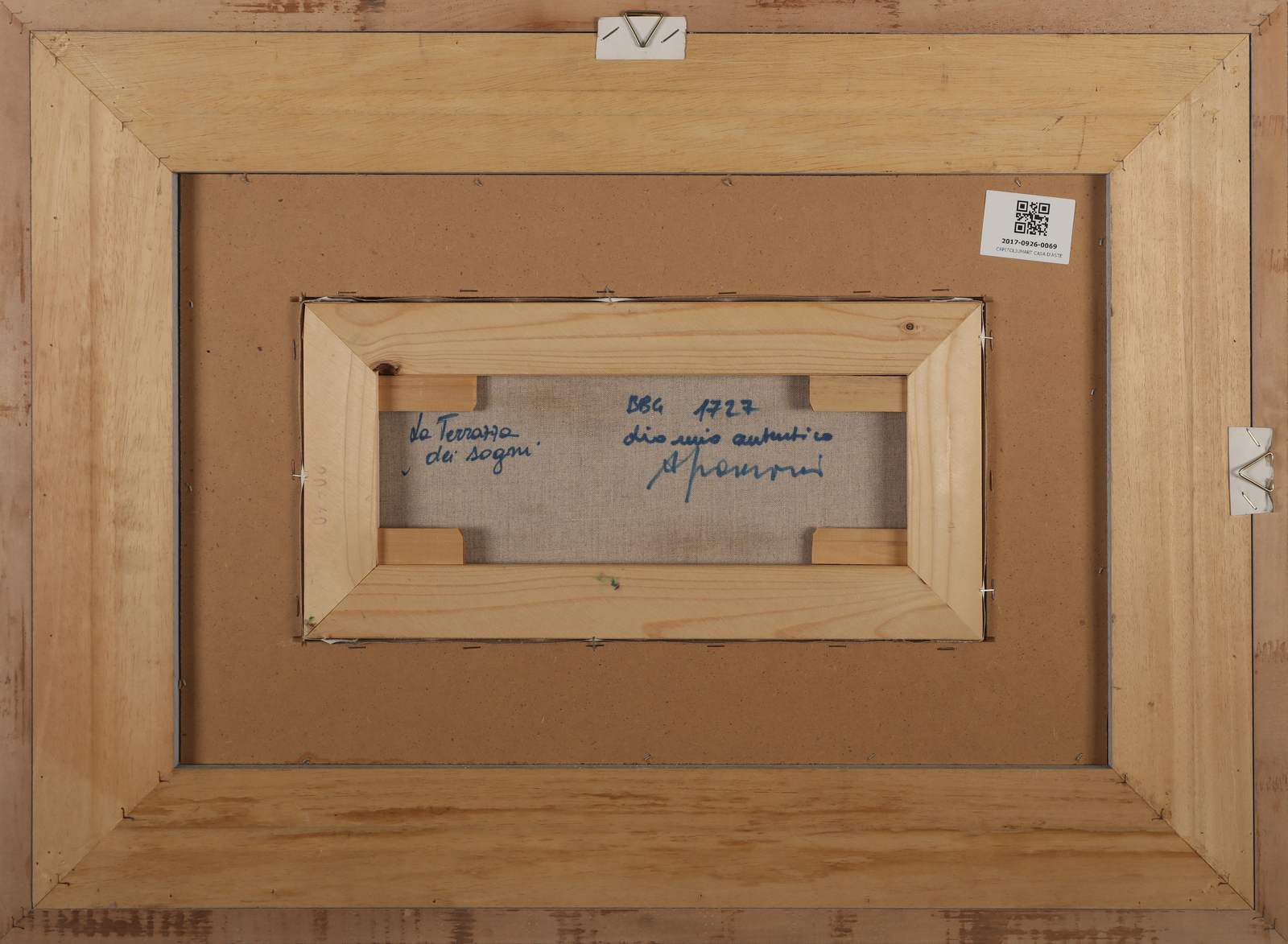 FACCINCANI ATHOS (n. 1951) La terrazza dei sogni. 2012. Olio su tela . Cm 40,00 x 20,00. Firma in basso a destra. Al retro titolo e firma. Autentica dell'artista su fotografia. Cornice presente