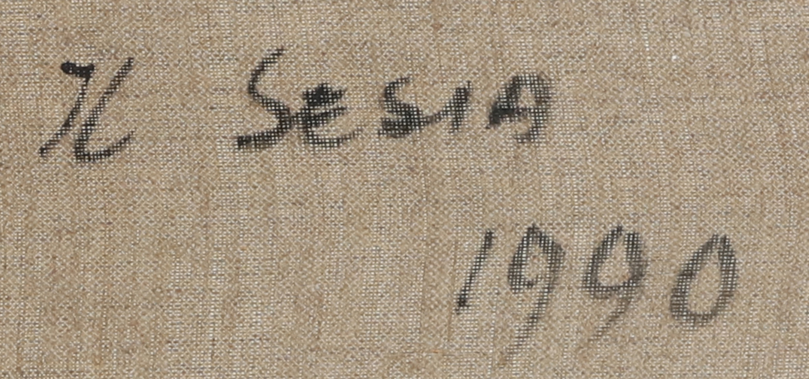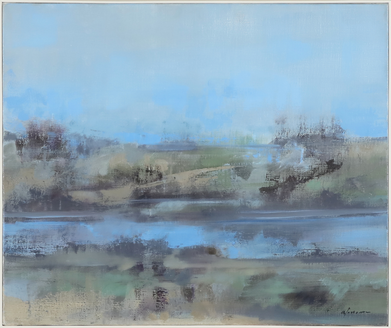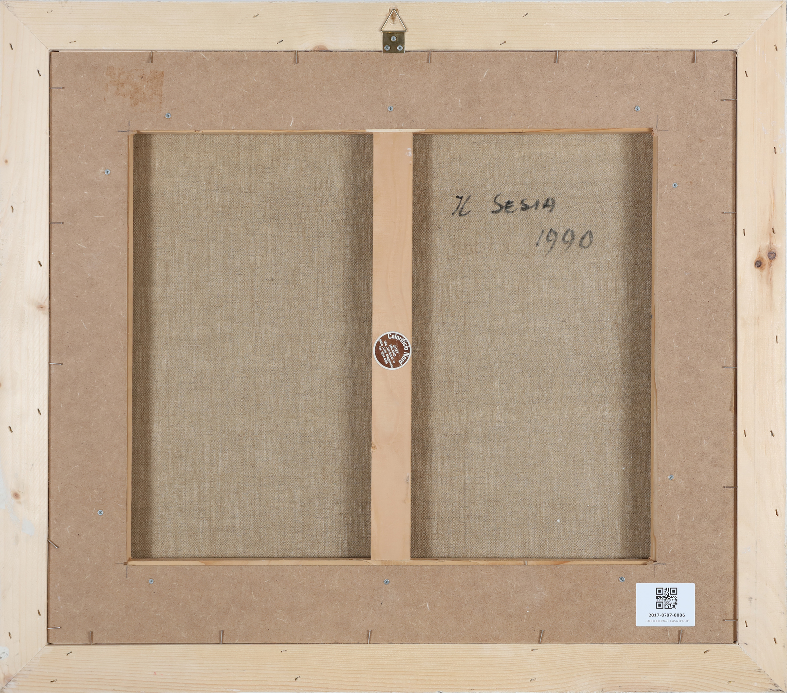 AJMONE GIUSEPPE (1923 - 2005) The Sesia. 1990. Oil on canvas . Cm 55,00 x 47,00. Signature lower right. At the back title and year. Artist's authenticity certificate on photo. Cornice presente