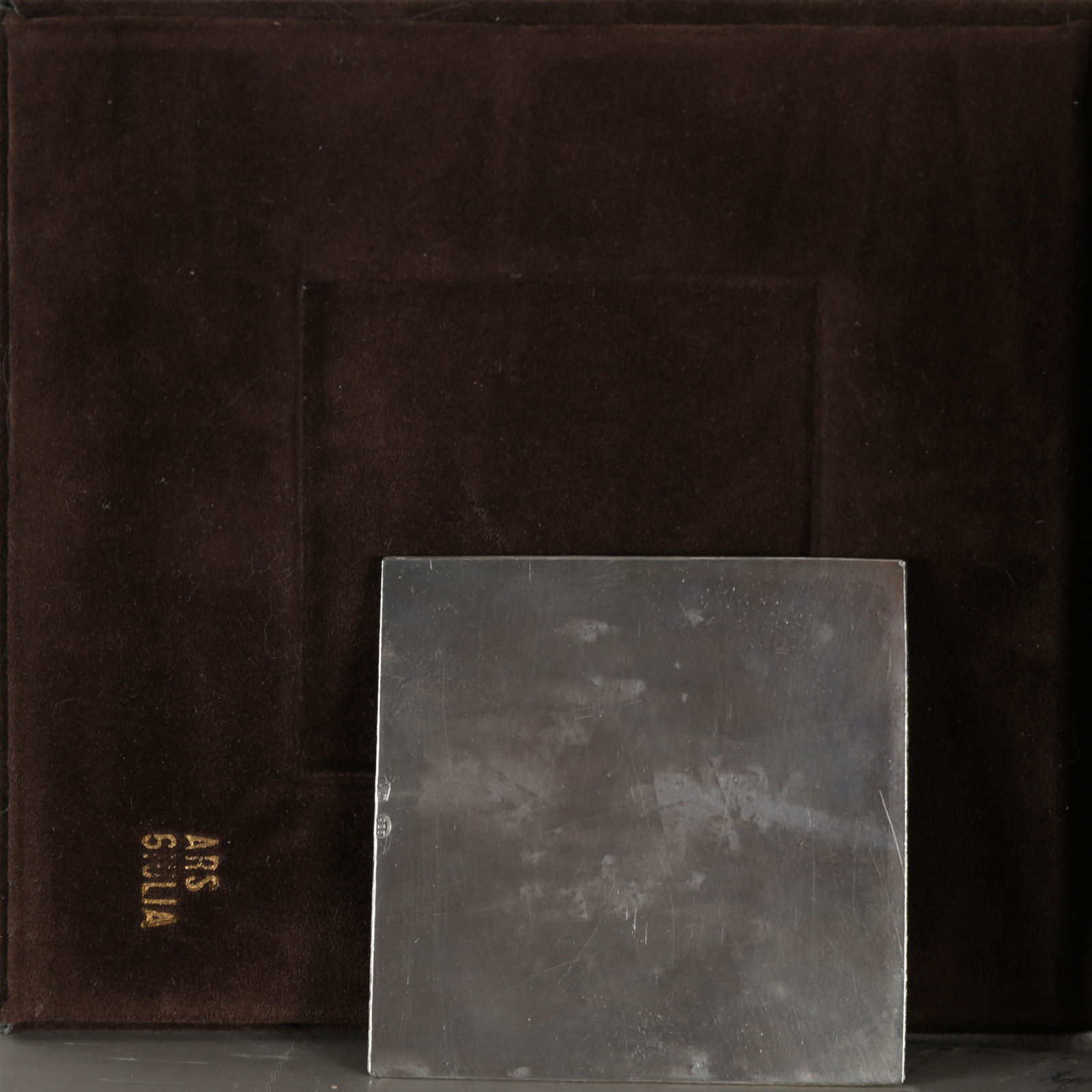 TAMAYO RUFINO (1899 - 1991) L'uomo e l'infinito. . Incisione su lamina. Cm 7,00 x 7,00. 522/2000. Tiratura e firma incise in basso. Lamina in oro puro con base in argento.