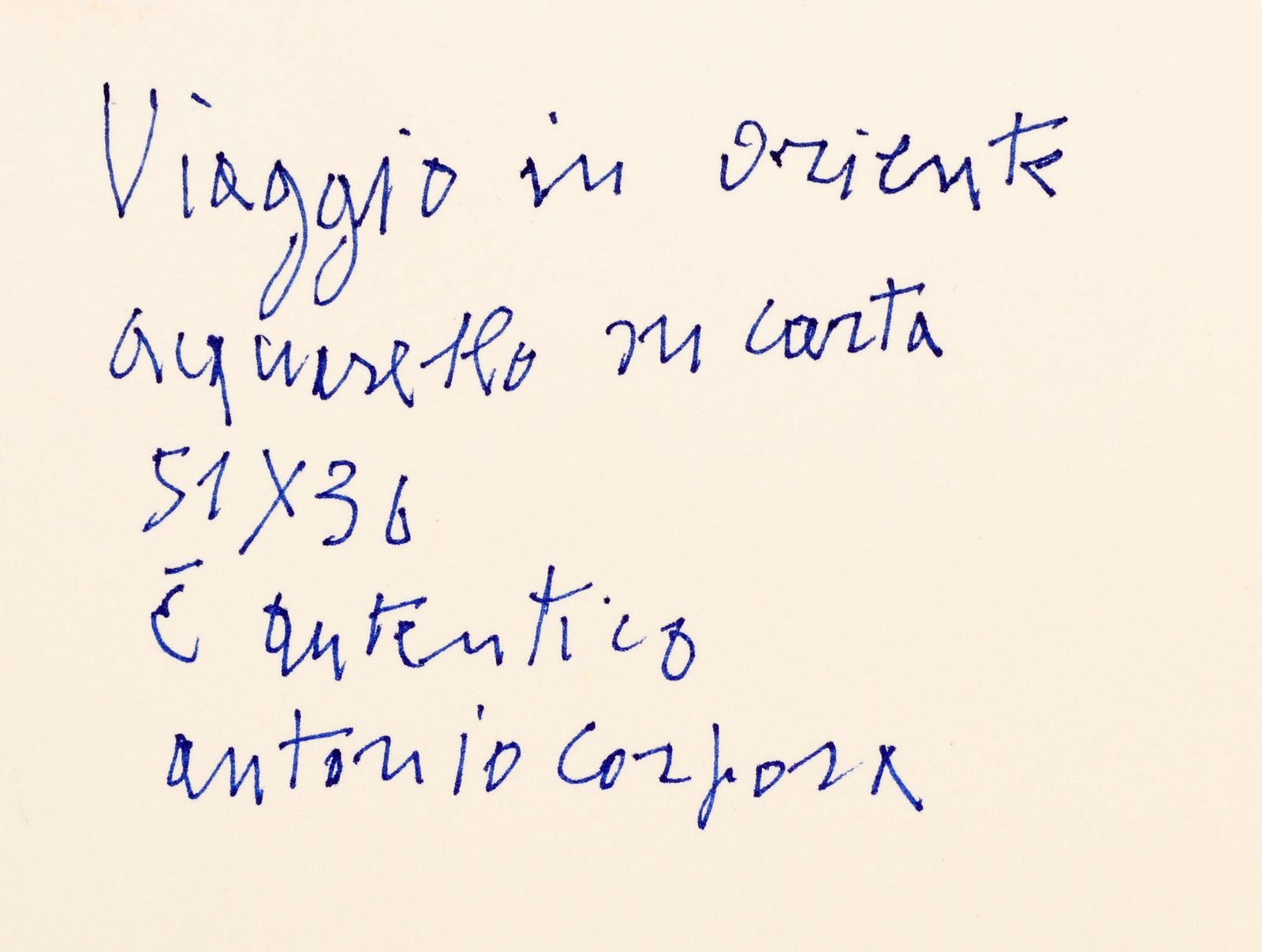 CORPORA ANTONIO (1909 - 2004) Viaggio in oriente. 1992. Acquarello su carta. Cm 36,00 x 51,00. Firma in basso a destra. Al retro titolo e firma. Opera archiviata presso l'Archivio Corpora, Roma come da documentazione fotografica allegata all'opera riportante il relativo numero d'inventario e la firma dell'artista.
