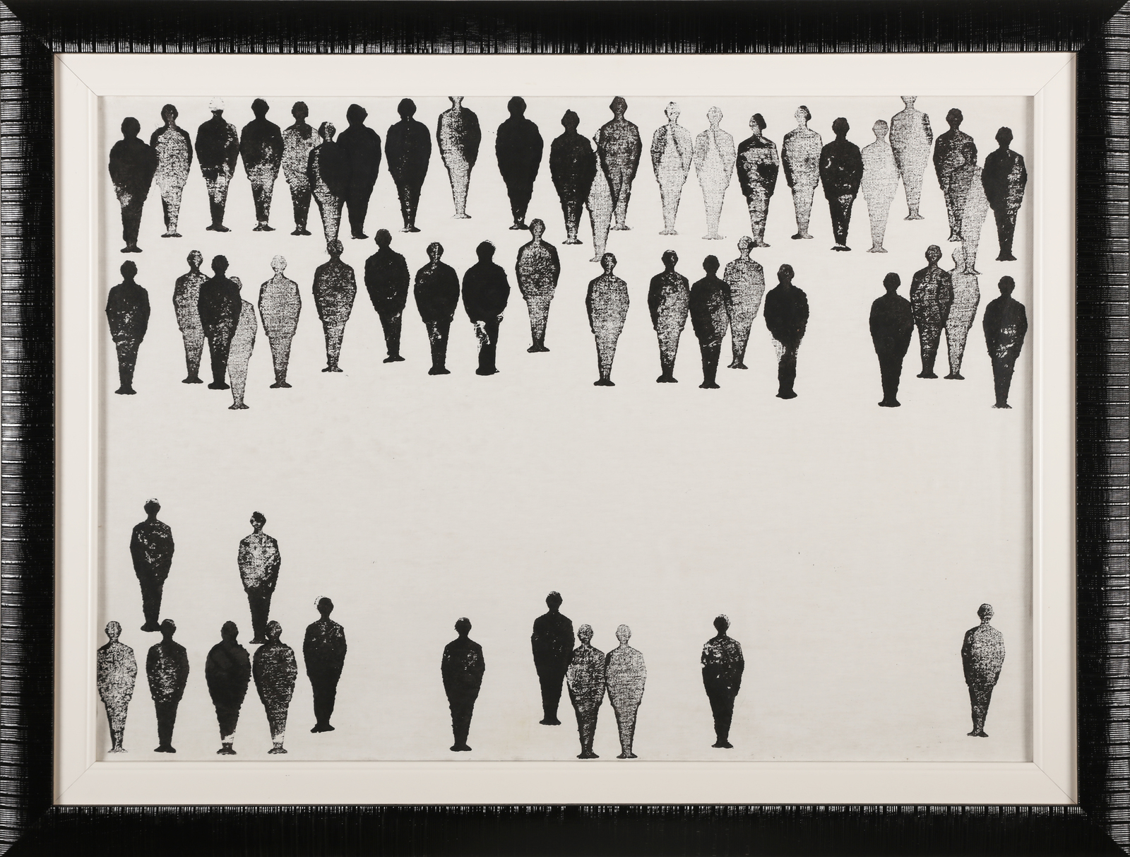 MAMBOR RENATO (n. 1936) Uomini timbro. 1963. Tecnica mista su tela. Cm 70,00 x 50,00. Firma al retro. Autentica dell'artista su fotografia. Cornice presente