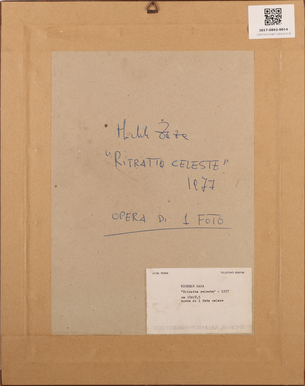 ZAZA MICHELE (n. 1948) Ritratto celeste. 1977. Fotografia. Cm 28,00 x 38,00. Pezzo unico. Al retro firma, titolo, anno e cartiglio descrittivo Galleria d'Arte Ugo Ferranti, Roma. Provenienza: Galleria Ugo Ferranti, Roma; Collezione Privata, Milano. Cornice presente