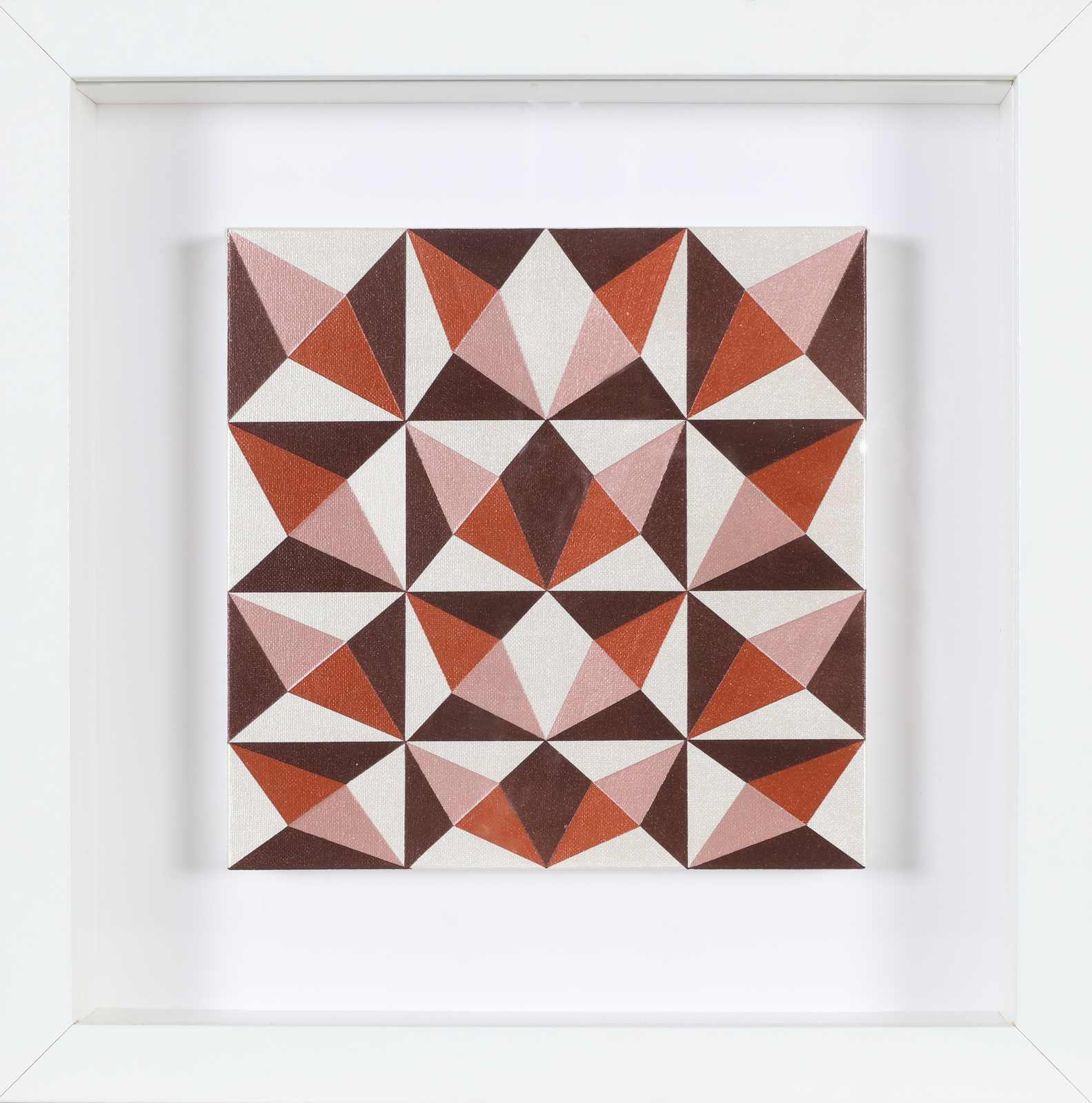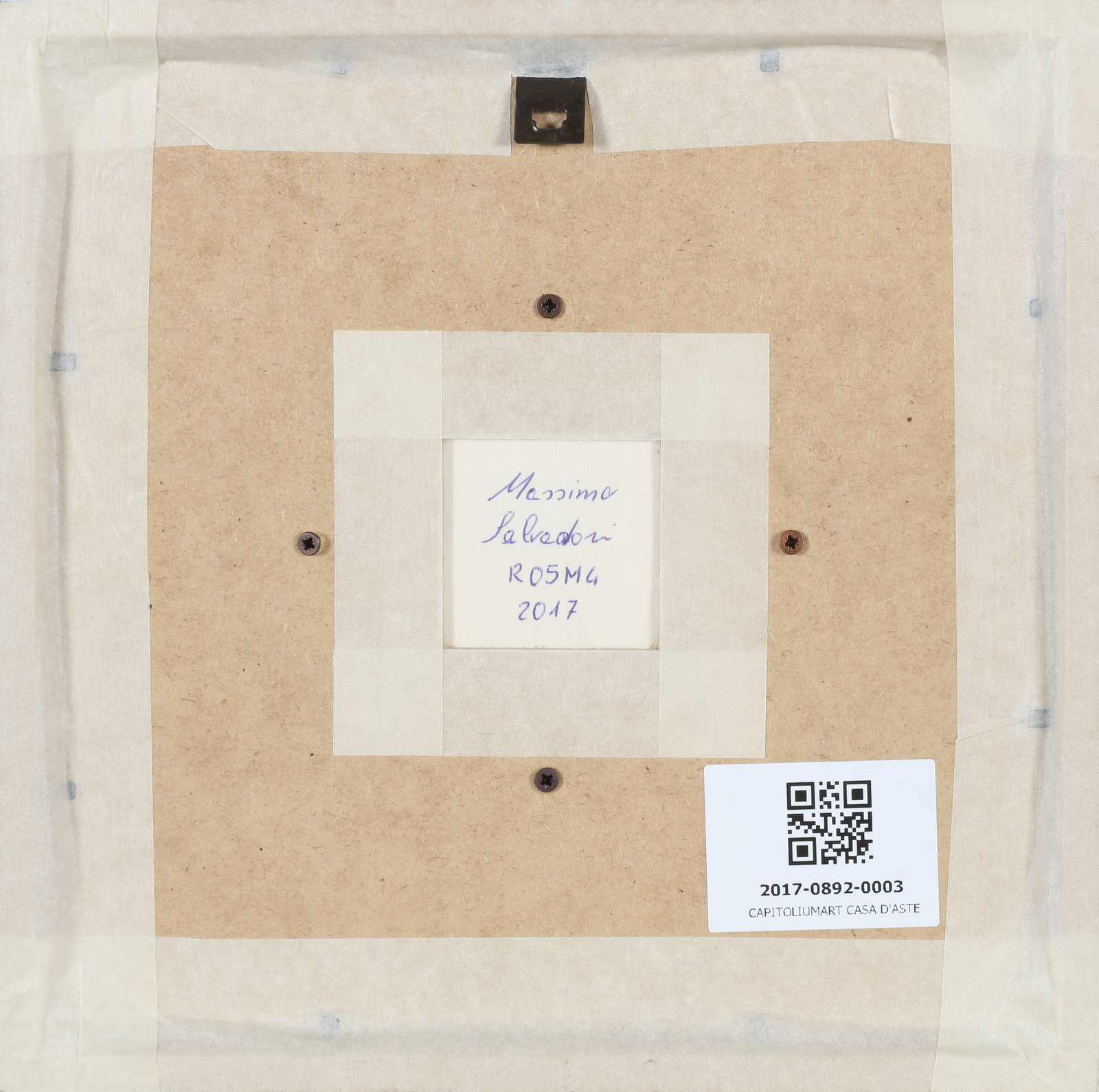 SALVADORI MASSIMO (n. 1960) R05M4. 2017. Acrilico su tela applicata su tavola. Cm 15,00 x 15,00. Al retro titolo, firma e anno. Autentica dell'artista su fotografia. Cornice presente