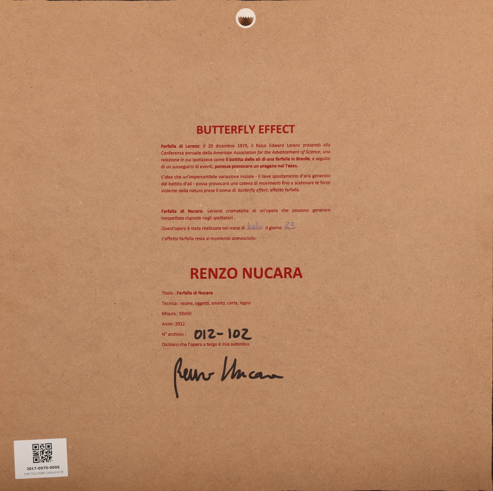 NUCARA RENZO (n. 1955) Butterfly effect. 2012. Mixed nomes on board. Cm 50,00 x 50,00. At the back artist's stamp with signature. Artist's authenticity certificate on photo. Within plexiglass case.