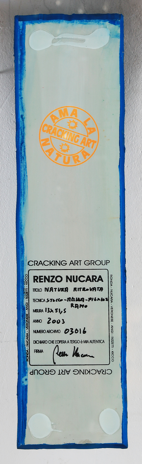 NUCARA RENZO (n. 1955) newfound nature. 2003. Pigments on wood. Cm 13,00 x 51,50. At the rear signature, title, year and Crackin Art stamp. Artist's authenticity certificate on photography.. Cornice presente