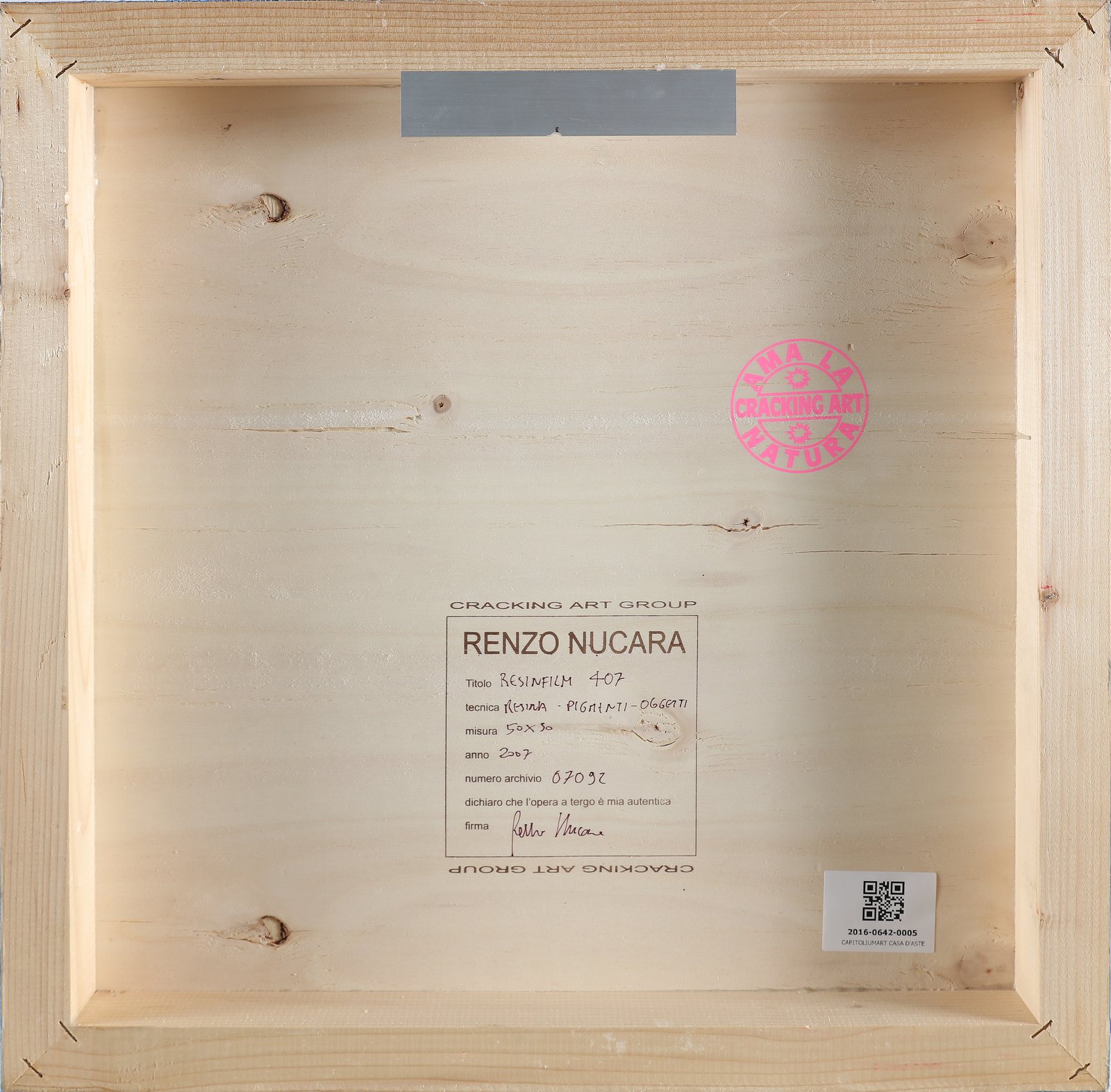 NUCARA RENZO (n. 1955) Resinfilm. 2007. Resin, objects, pigments.. Cm 50,00 x 50,00. At the back Cracking Art label with stamp.Artist's authenticity certificate on photo.