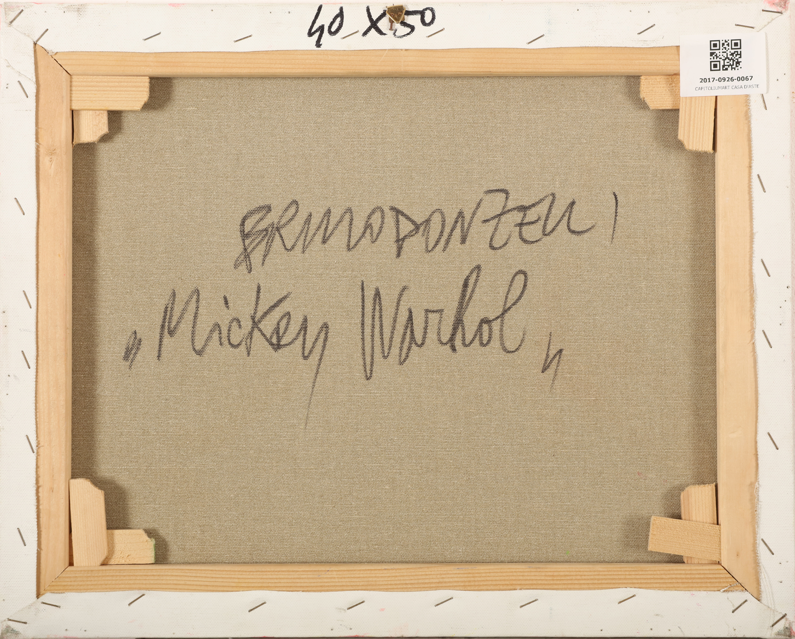 DONZELLI BRUNO (n. 1941) Mickey Warhol. Oil on canvas . Cm 50,00 x 40,00. Signature lower right. At the back signature and title. Artist's authenticity certificate on photo.