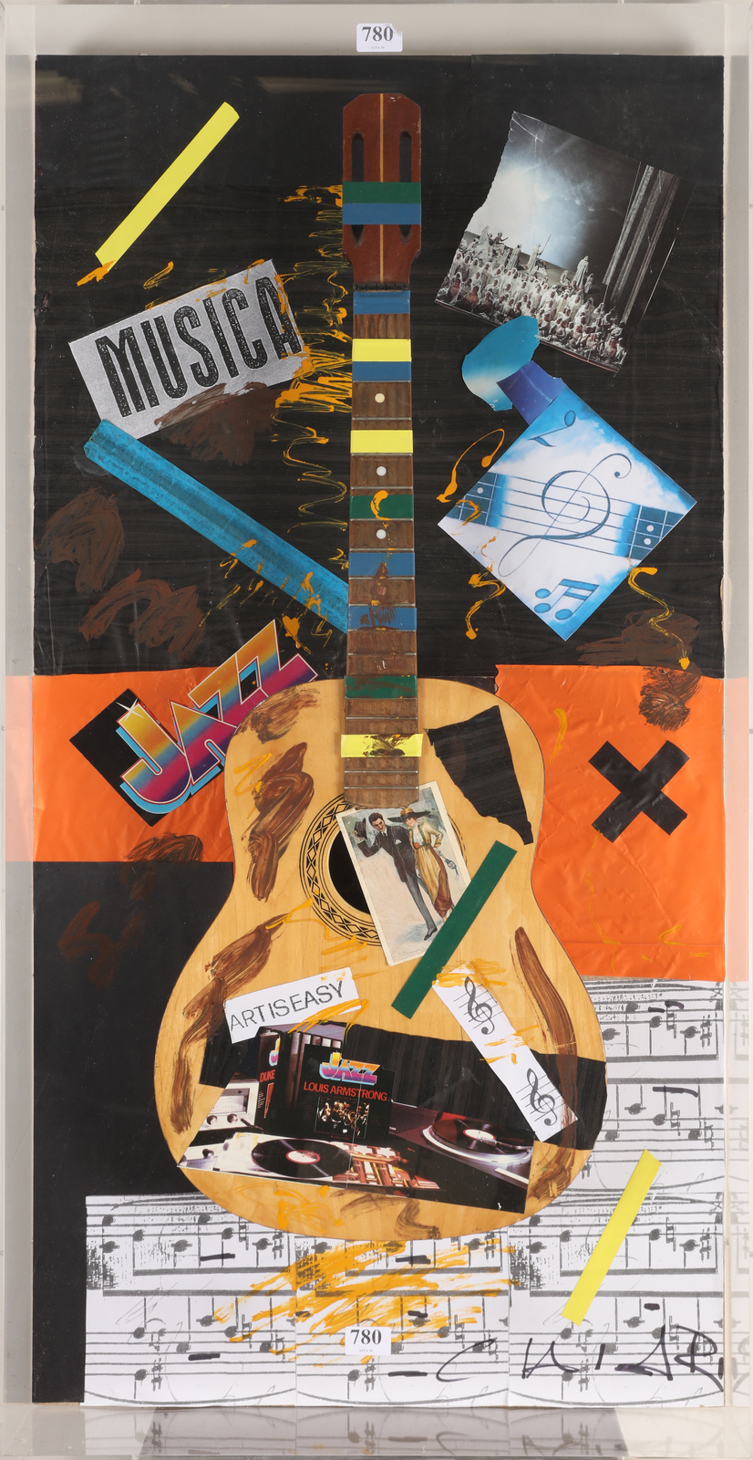 CHIARI GIUSEPPE (1926 - 2007) Chitarra. strumento su tavola. Cm 61,00 x 121,00 x 13,00. Firma in basso a destra. Opera contenuta in una teca di plexiglass. Autentica dell'artista su fotografia. Cornice presente