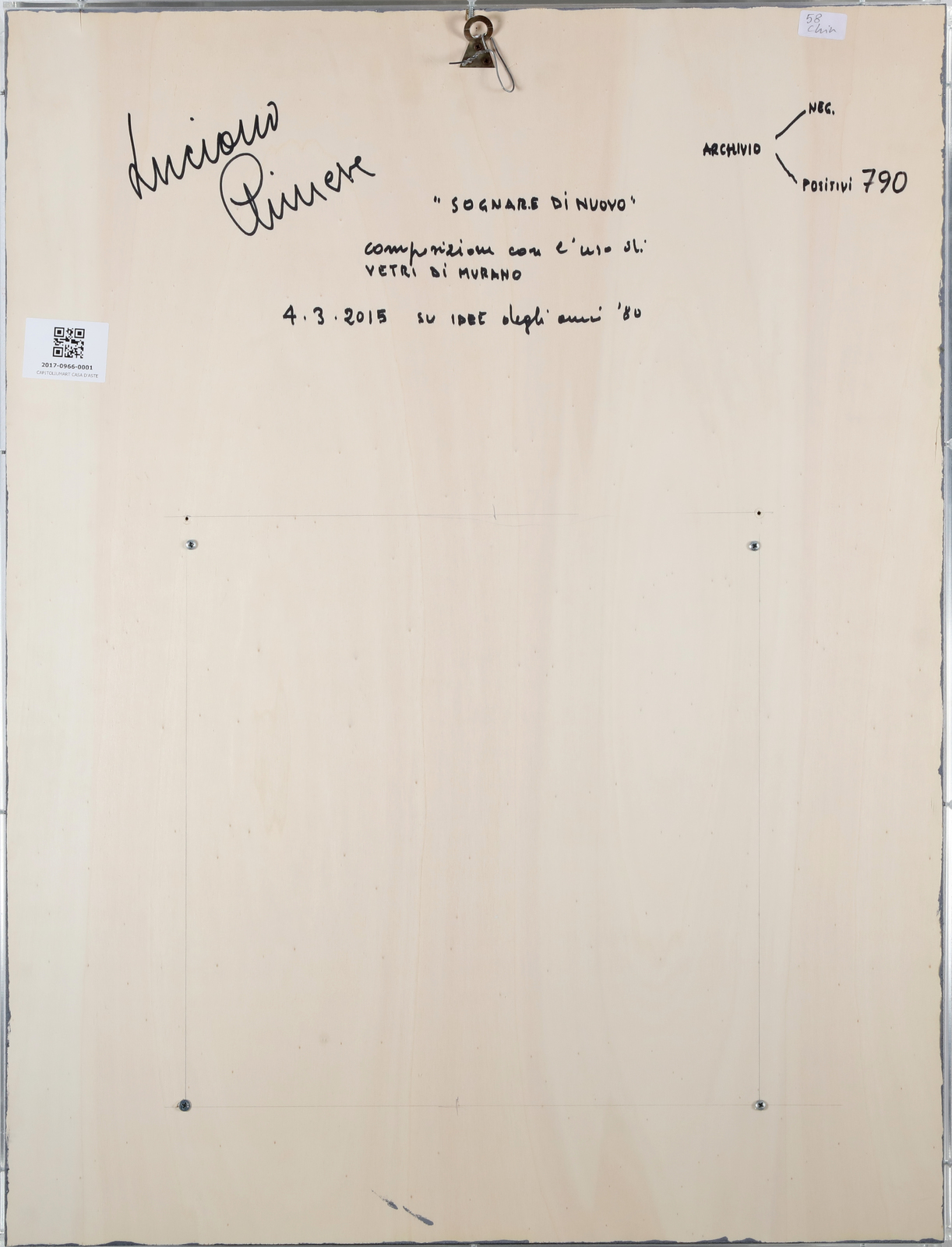CHINESE LUCIANO (n. 1942) Sognare di nuovo. 2015. Tecnica mista su tavola. Cm 60,00 x 80,00. Firma in basso a destra. Al retro titolo titolo, firma e anno. Autentica dell'artista su fotografia. Opera contenuta in una teca di plexiglass. Cornice presente