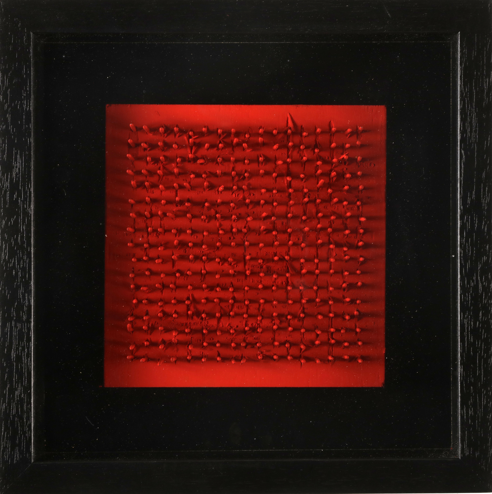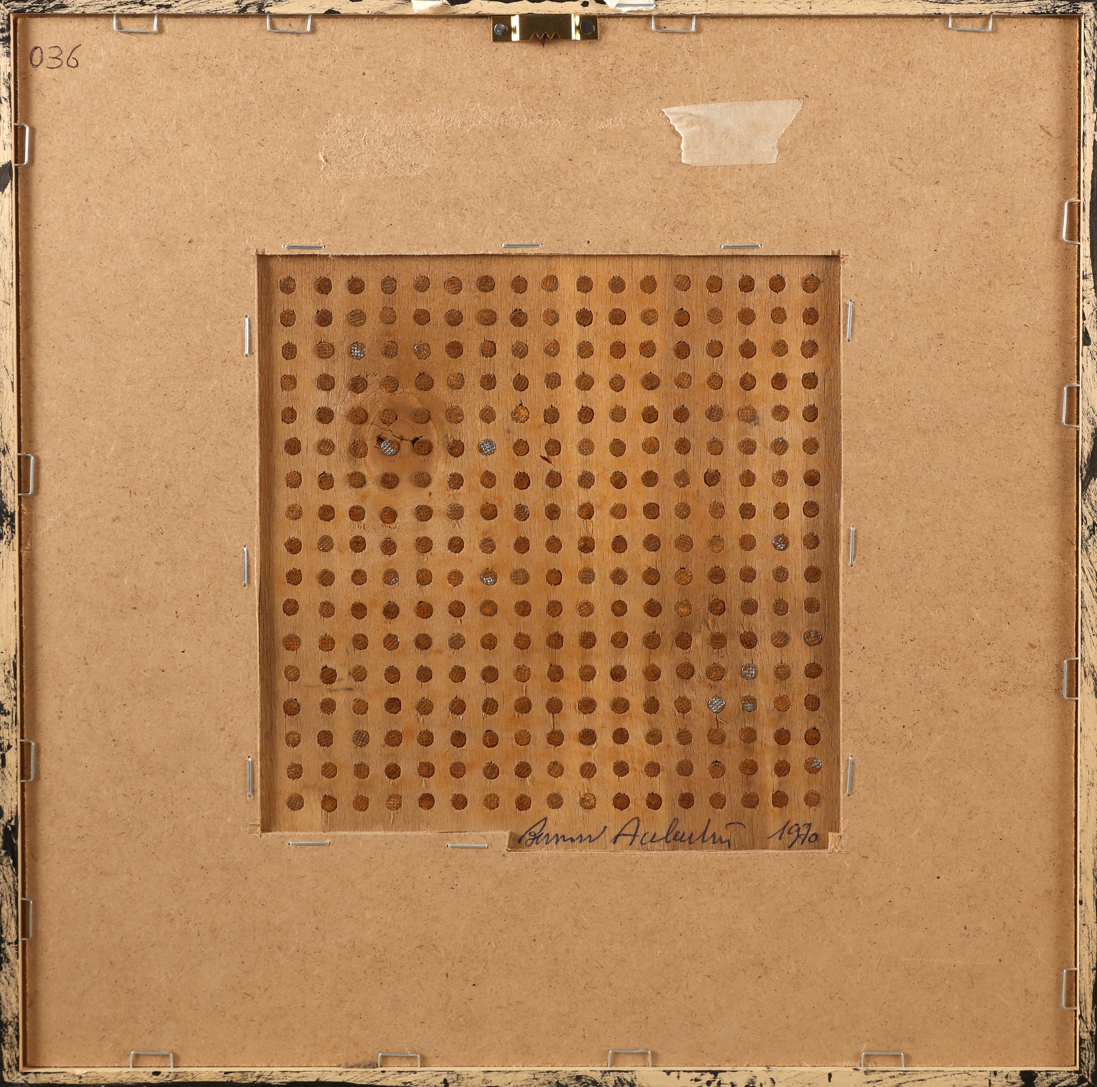 AUBERTIN BERNARD (1934 - 2015) Tableau clous. 1970. Chiodi su tavola. Cm 20,00 x 20,00. Al retro firma e anno. Autentica dell'artista su fotografia. Opera archiviata presso l'Archivio delle opere di Bernard Aubertin, Brescia come da documentazione fotografica allegato all'opera riportante il relativo numero d'inventario. Cornice presente
