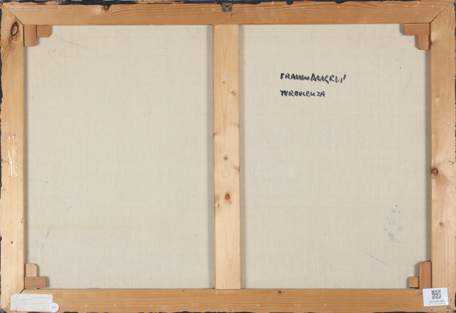 ANGELI FRANCO (1935 - 1988) Turbolenza. 1986. Smalto su tela. Cm 100,00 x 70,00. Firma e titolo al retro. Autentica su fotografia Angiolino Calestani - Arte Contemporane, Milano. Certificato di Garanzia e Autenticità a cura della Casa delle Aste Meeting Art, Vercelli. Provenienza: Quadreria, Milano. Opera archiviata presso l'Archivio Franco Angeli, come da documentazione fotografica allegata all'opera riportante il relativo numero di inventario. . Cornice presente