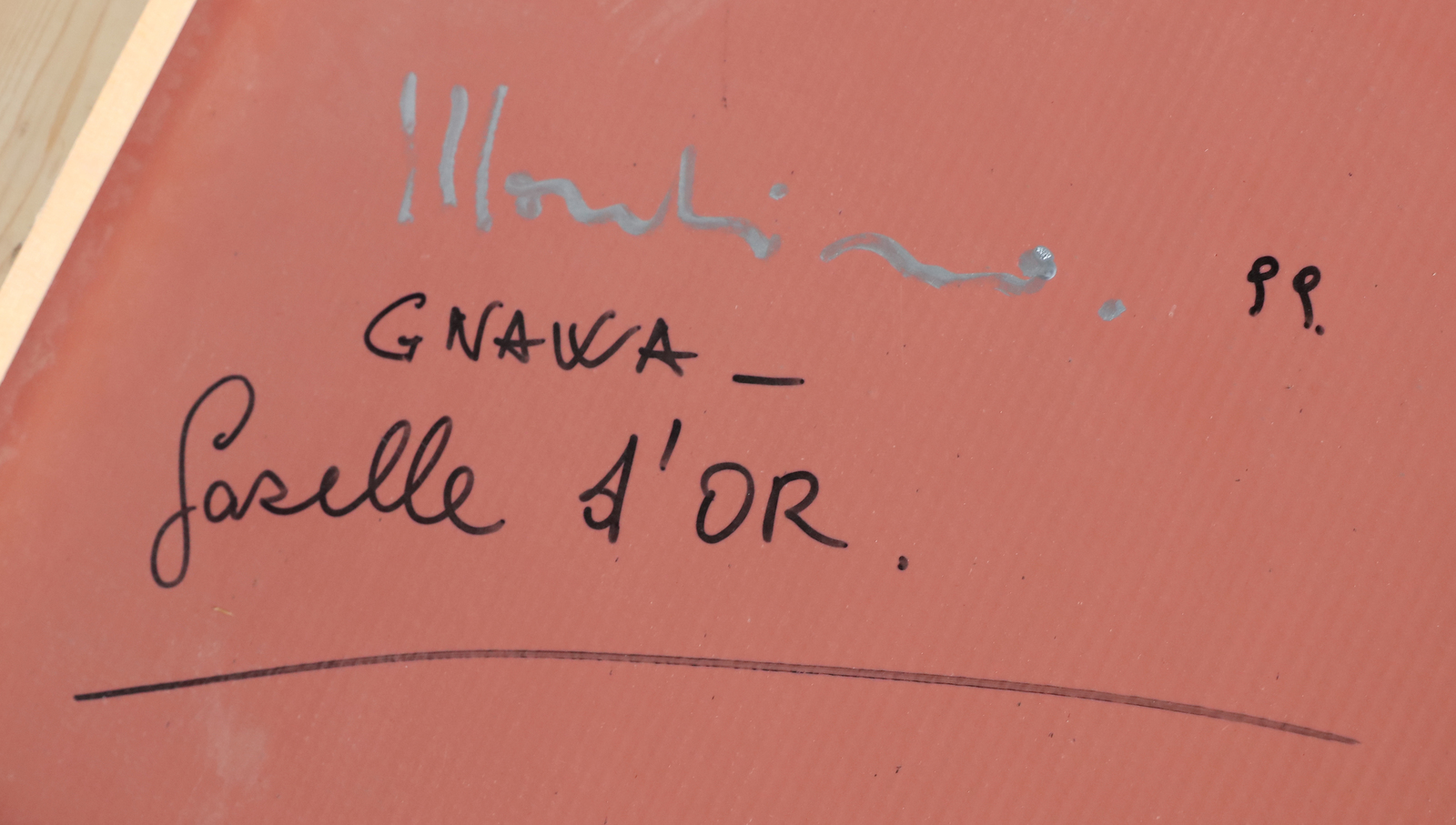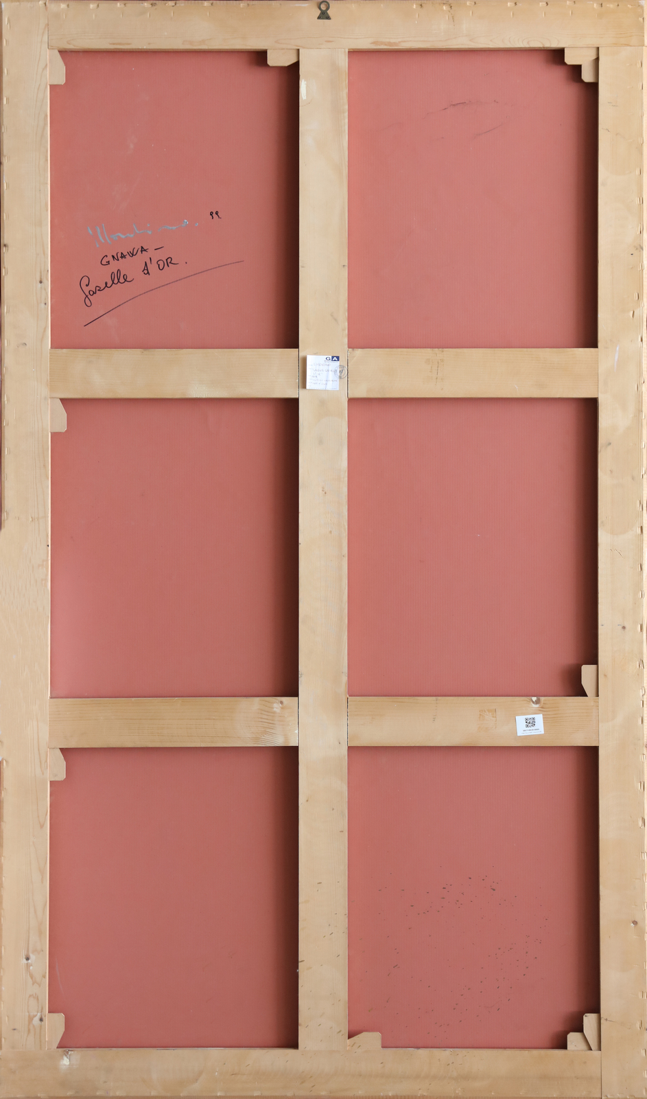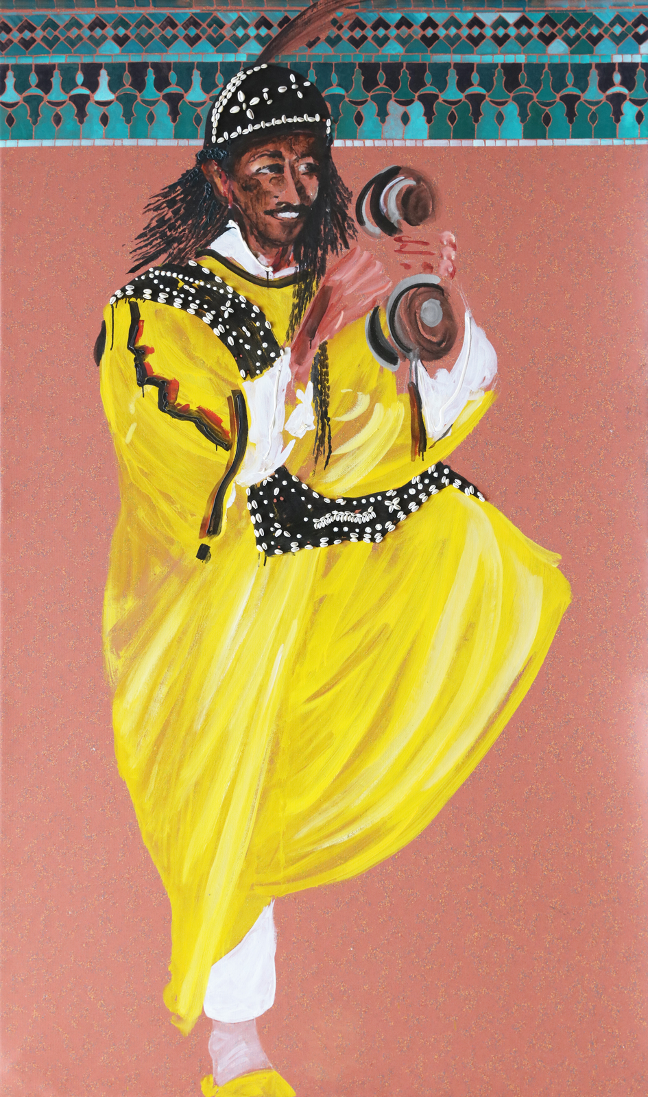 MONDINO ALDO (1938 - 2005) Gnawa - Gazelle d'or. 1999. Olio su linoleum. Cm 130,00 x 220,00. Al retro titolo, firma, anno e cartiglio descrittivo con timbro Galleria Astuni, Fano.Pubblicazione: Catalogo della mostra Aldo Mondino, Galleria d'Arte L'incontro, Chiari, 16 Marzo- 7 Aprile 2002, pag.17.