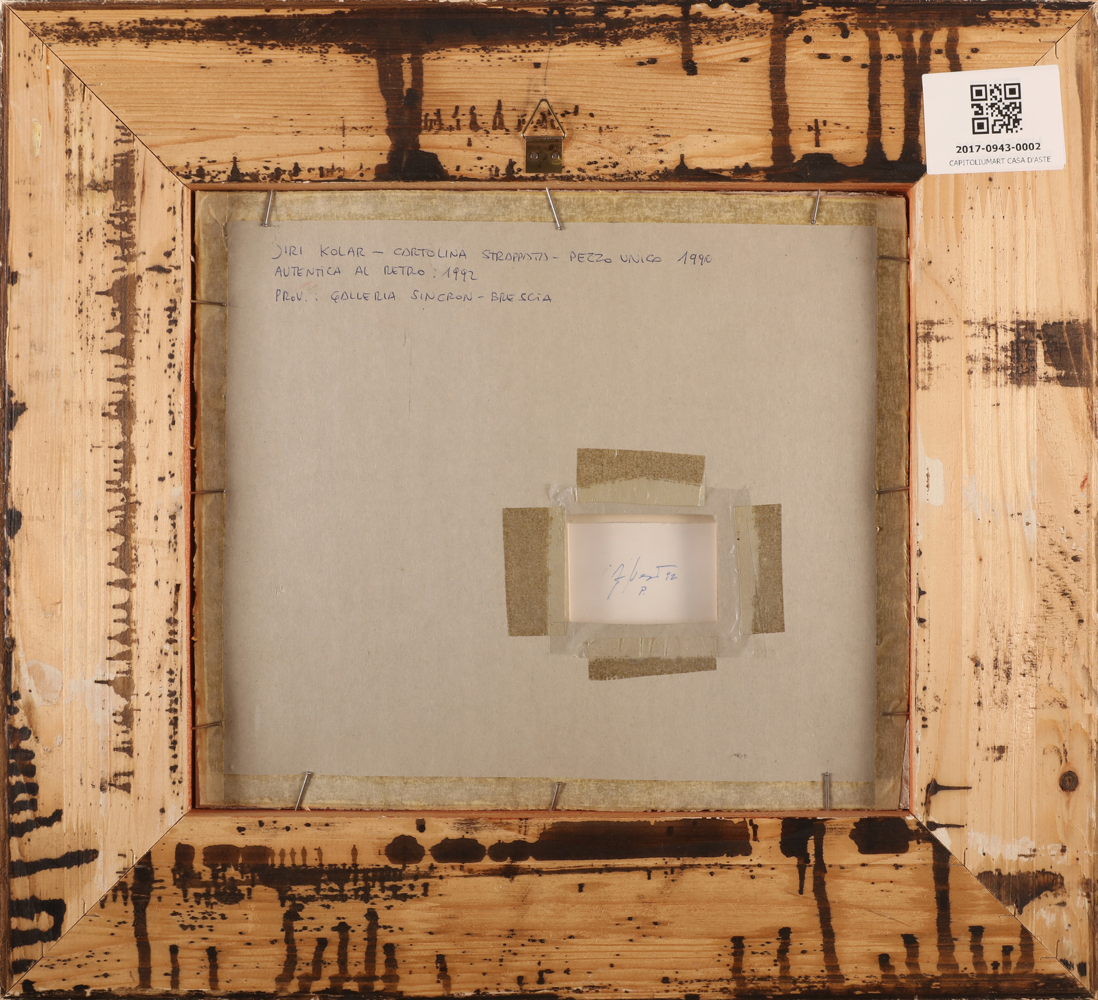KOLAR JIRI (1914 - 2002) Senza titolo. Intervento su cartolina. Cm 14,50 x 10,50. Firma e anno in basso a destra e al retro. Certificato di autenticità e garanzia Barizza Egidio, Lurago d'Erba. Provenienza: Galleria Sincron, Brescia. Cornice presente