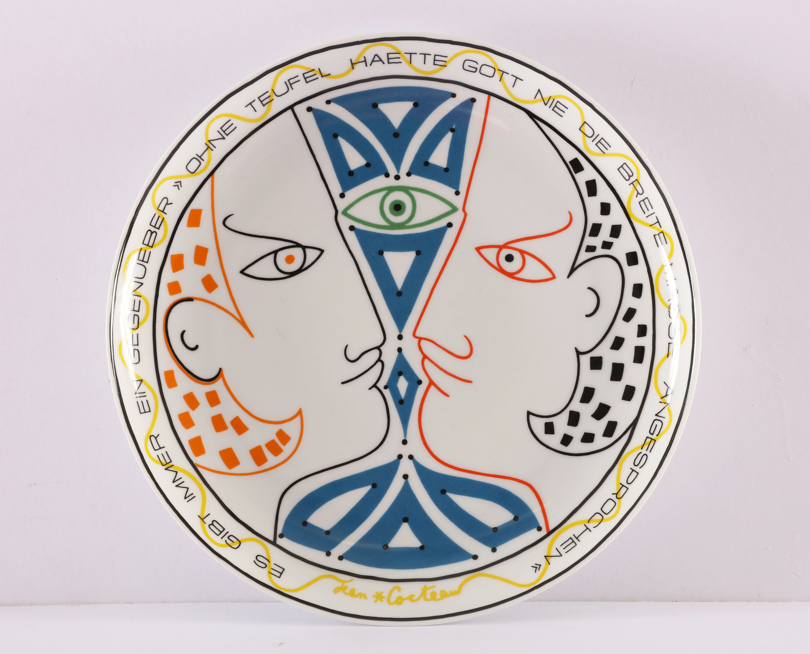 COCTEAU JEAN (1889 - 1963) Plate. Ceramic. Cm 26,00 x 3,00 x 26,00. 282/5000. Signature lower centre. At the back edition and Rosenthal studio linie, Germany stamp.