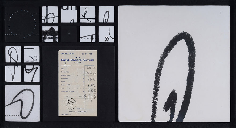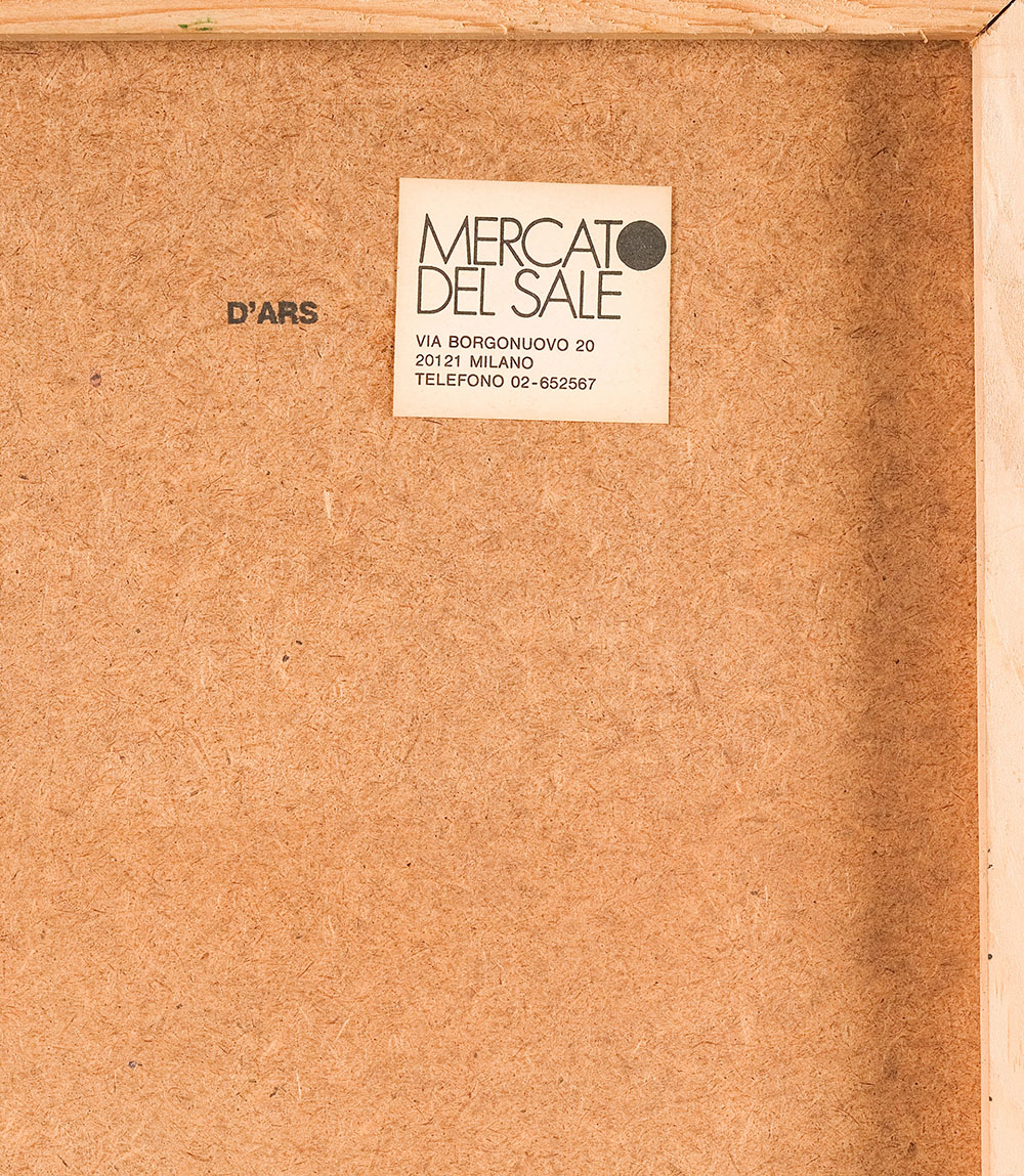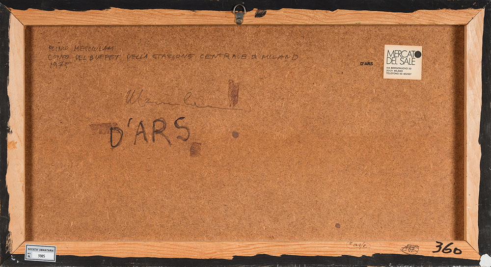 PLINIO MESCIULAM 1926 Conto del buffet della stazione centrale di Milano, 1975 Assemblaggio di tavole e carta applicate su masonite, cm. 37 x 70 Firmato e datato sul retro Etichetta Mercato del Sale, Milano sul retro Timbro D’Ars, Milano sul retro Prov. Collezione Fondazione D’Ars Oscar Signorini Onlus, Milano