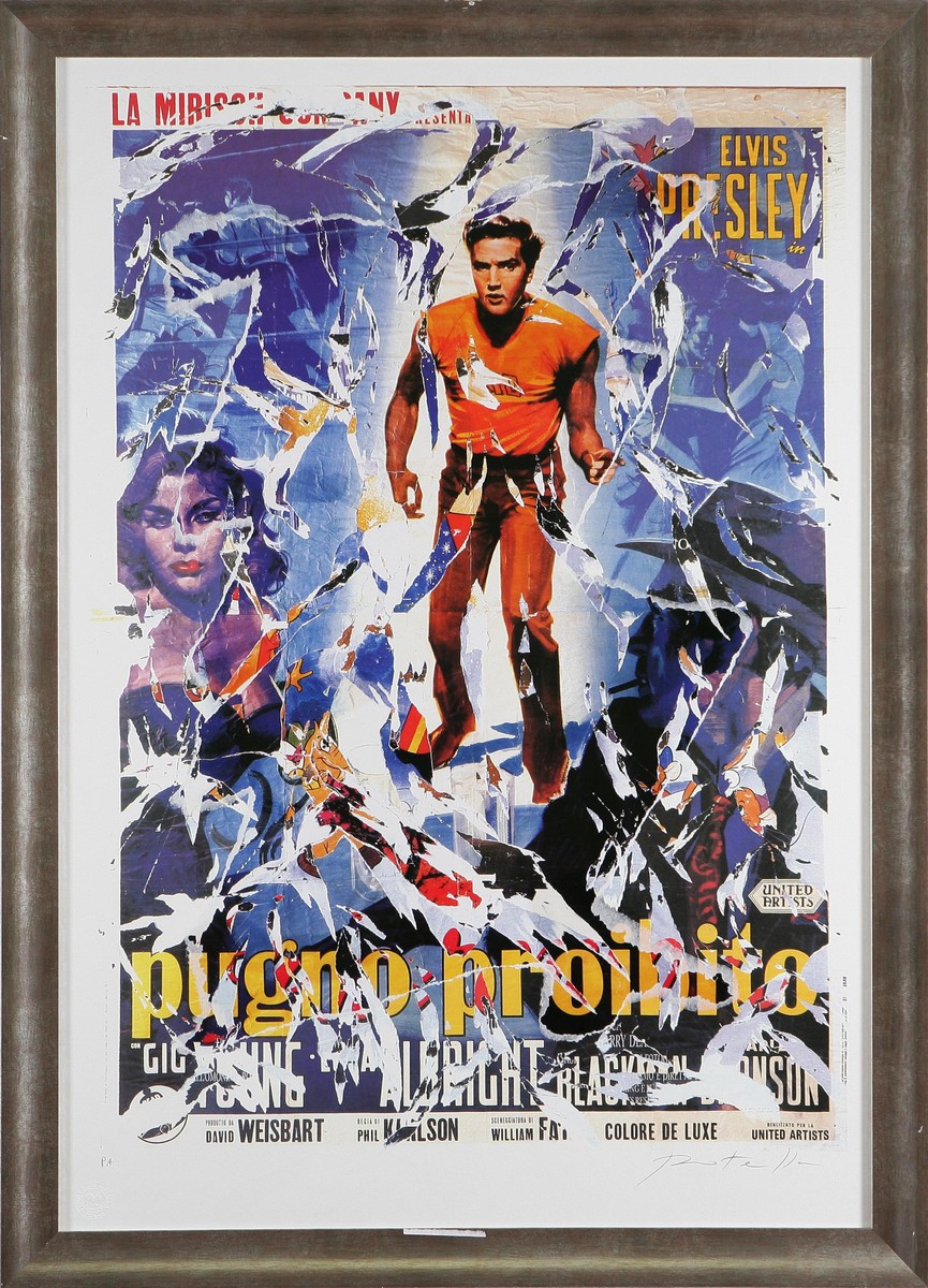 ROTELLA MIMMO (1918 - 2006) Pugno proibito. Litodecollage, cm 70x100. Tir. P.A. in matita in basso a sinistra, Timbro a secco della Fondazione Rotella in basso a sinistra. Firma a matita in basso a destra. Cornice presente.
