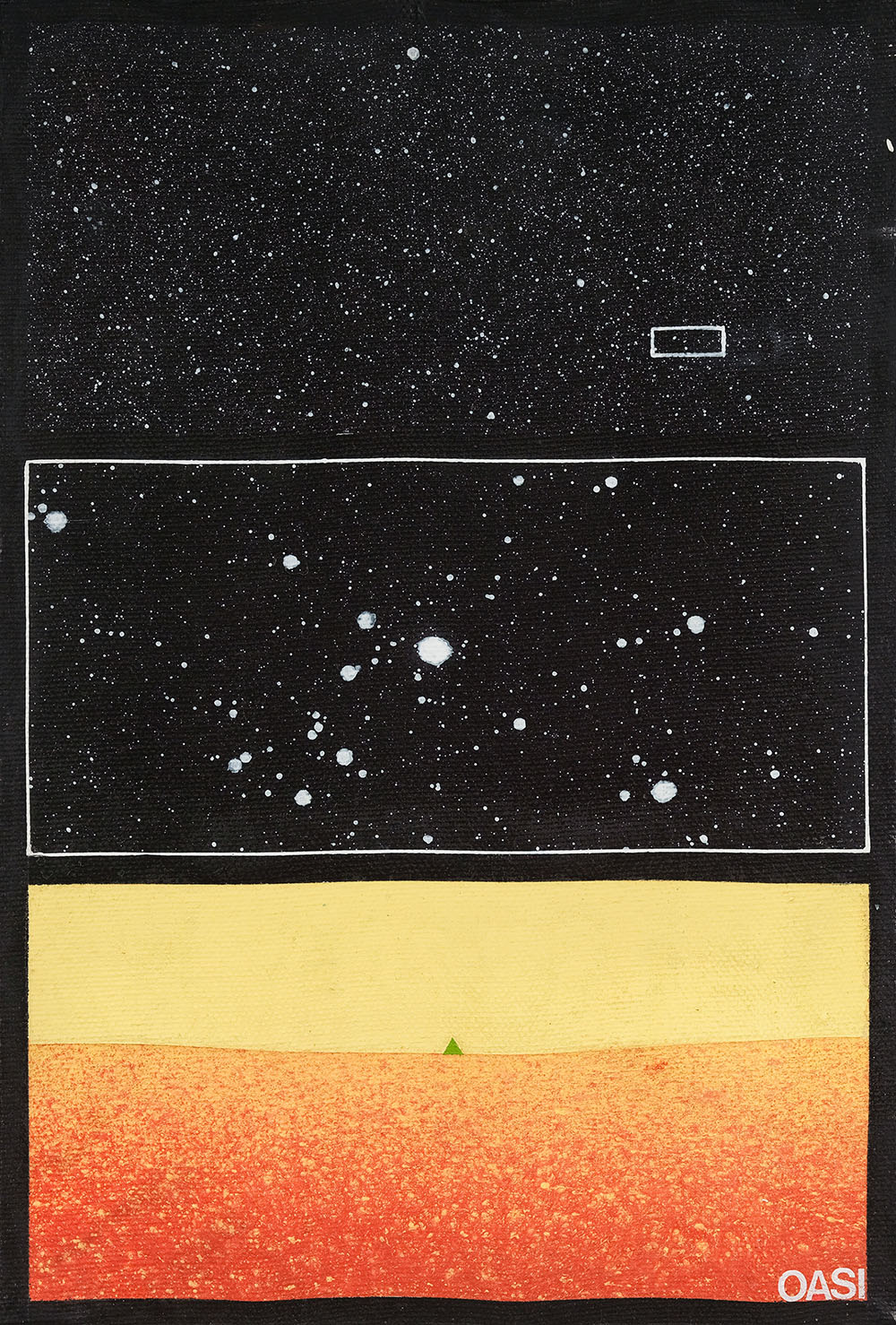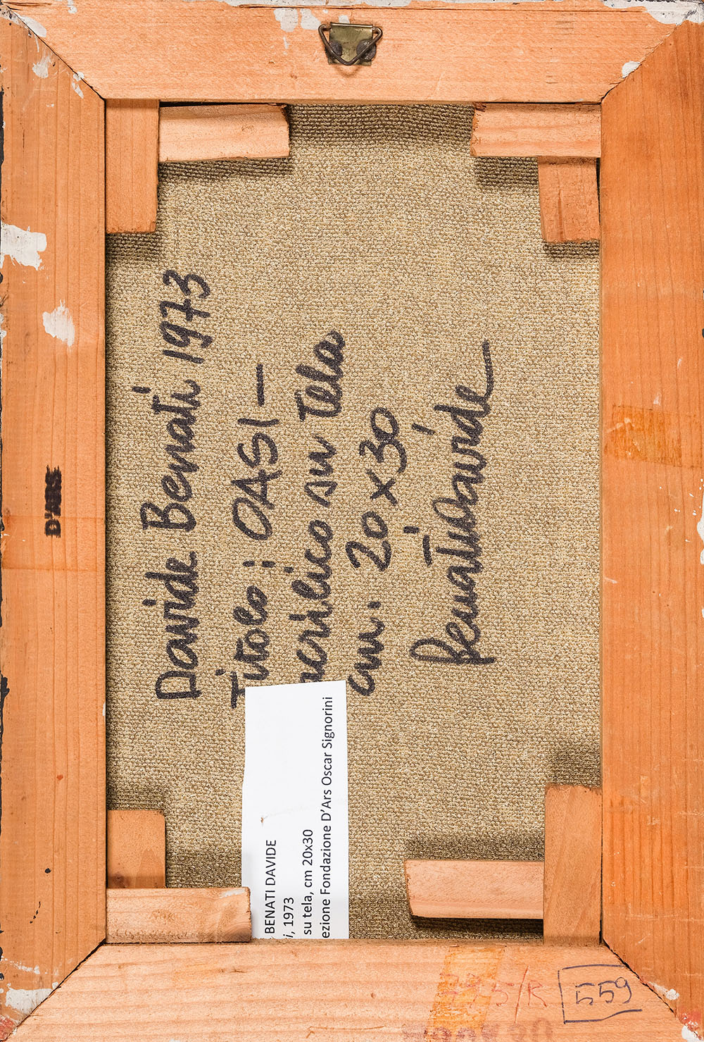 DAVIDE BENATI 1949 Oasi, 1973 Acrilico su tela, cm. 30 x 20 Firmato e datato sul retro Timbro D’Ars, Milano sul retro Prov. Collezione Fondazione D’Ars Oscar Signorini Onlus, Milano