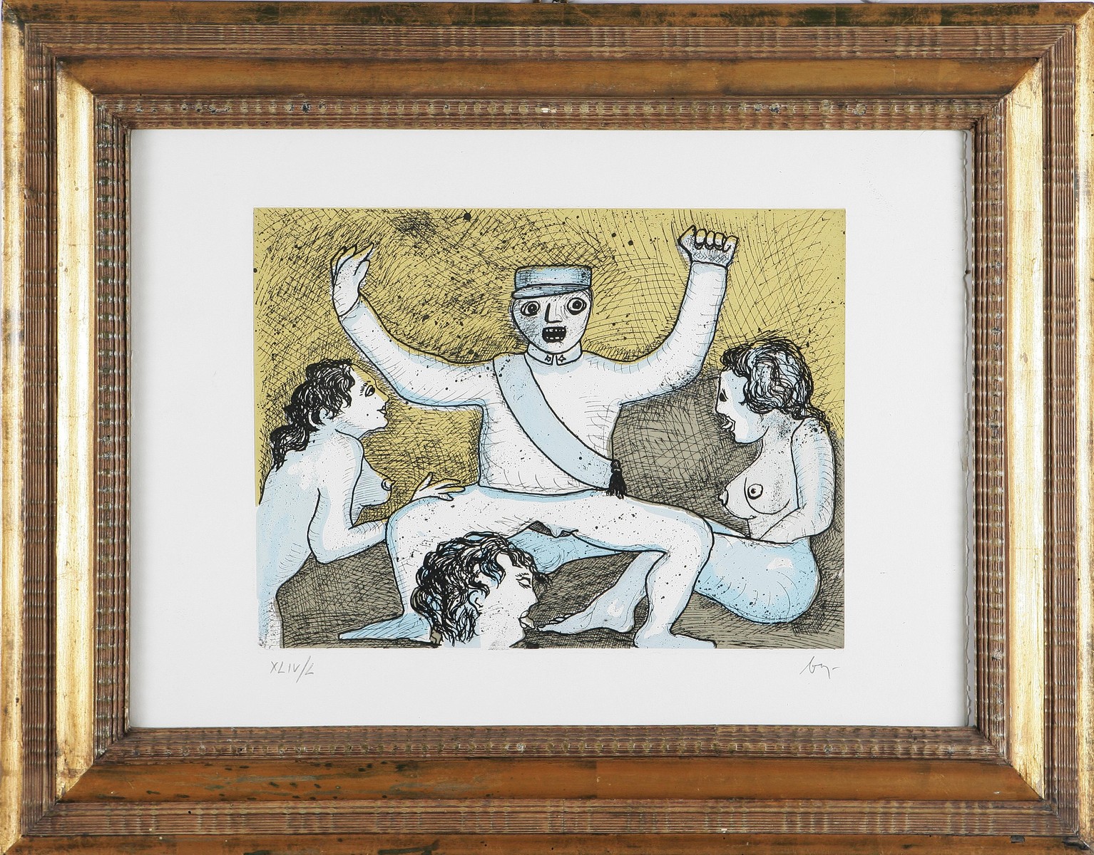 BAJ ENRICO (1924 - 2003) Senza titolo. Litografia, cm 70x50. Misure disegno: altezza 36 cm, larghezza 48 cm. Tir. XLIV/L a matita in basso a sinistra. Firmato a matita in basso a destra. Cornice presente.