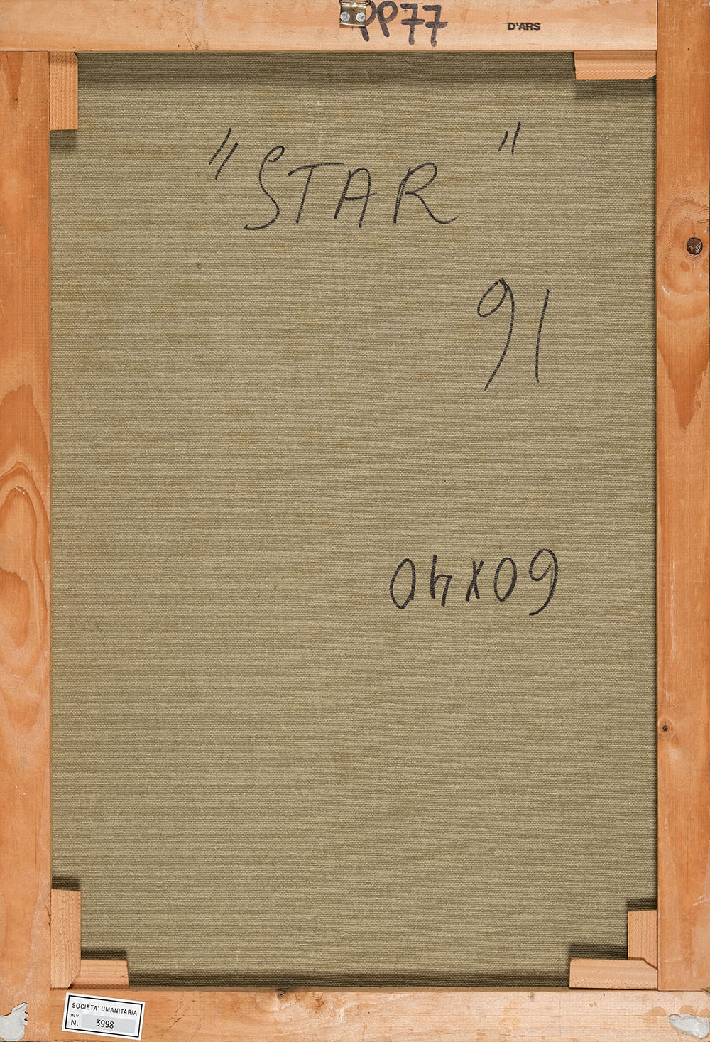 MIMMO ROTELLA 1928 - 2006 Star, 1991 Tecnica mista su carta telata, cm. 60 x 40 Firmato e datato in basso a destra Timbro D’Ars, Milano sul retro Prov. Collezione Fondazione D’Ars Oscar Signorini Onlus, Milano