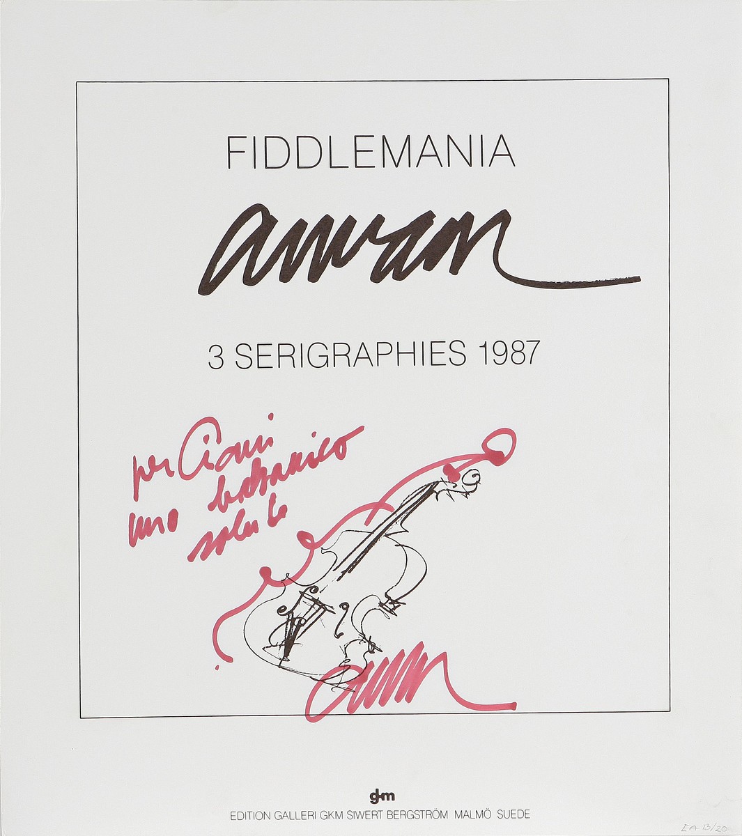 ARMAN FERNANDEZ (1928 - 2005) Fiddlemania arman 3 serigraphies 1987. 1987 Portfolio, tir. EA 13/20. Edizione 1/200- EA 20/20 - I/X Ogni serigrafia è numerata e firmata a matita dall'autore. Dedica sulla copertina. Edizioni Galleri 9km siwert bergstrom malmo suede. Condizioni perfette.