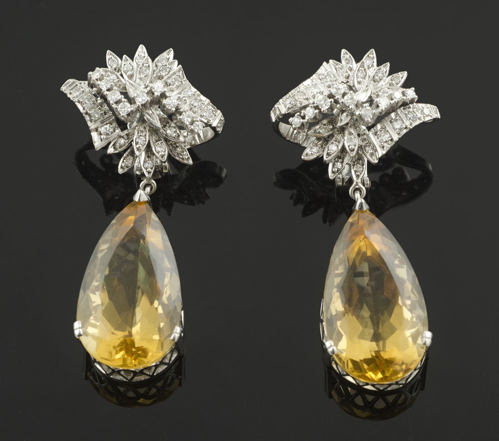 Lot 59 | Paio di orecchini in oro giallo e brillanti con goccia di topazio. gr. 38,6.