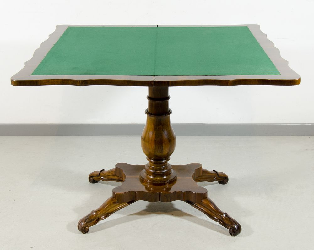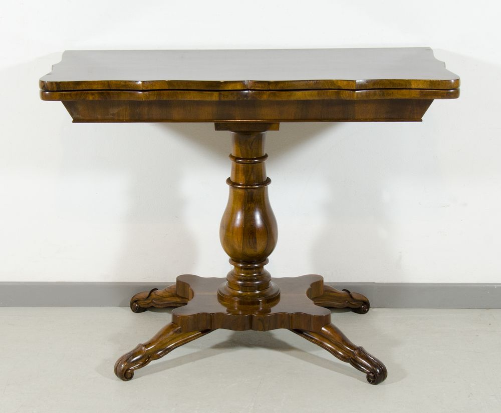 Tavolo/consolle apribile con piano sagomato, gamba centrale ripartita su 4 piedini. XIX secolo. cm. 76x98x49.