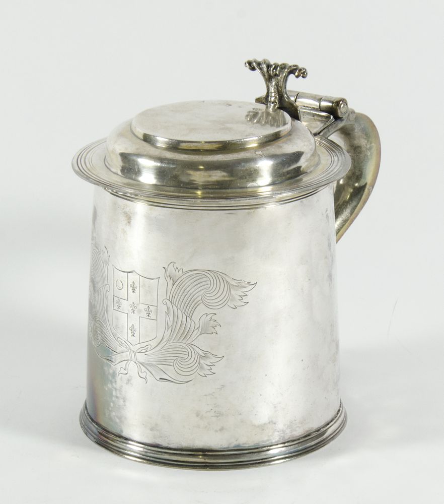 Tankard in argento su corpo clindrico liscio e stemma incisio, presa a ricciolo e manico a voluta. Londra, I metà XVIII secolo. H. cm. 17. gr. 750.